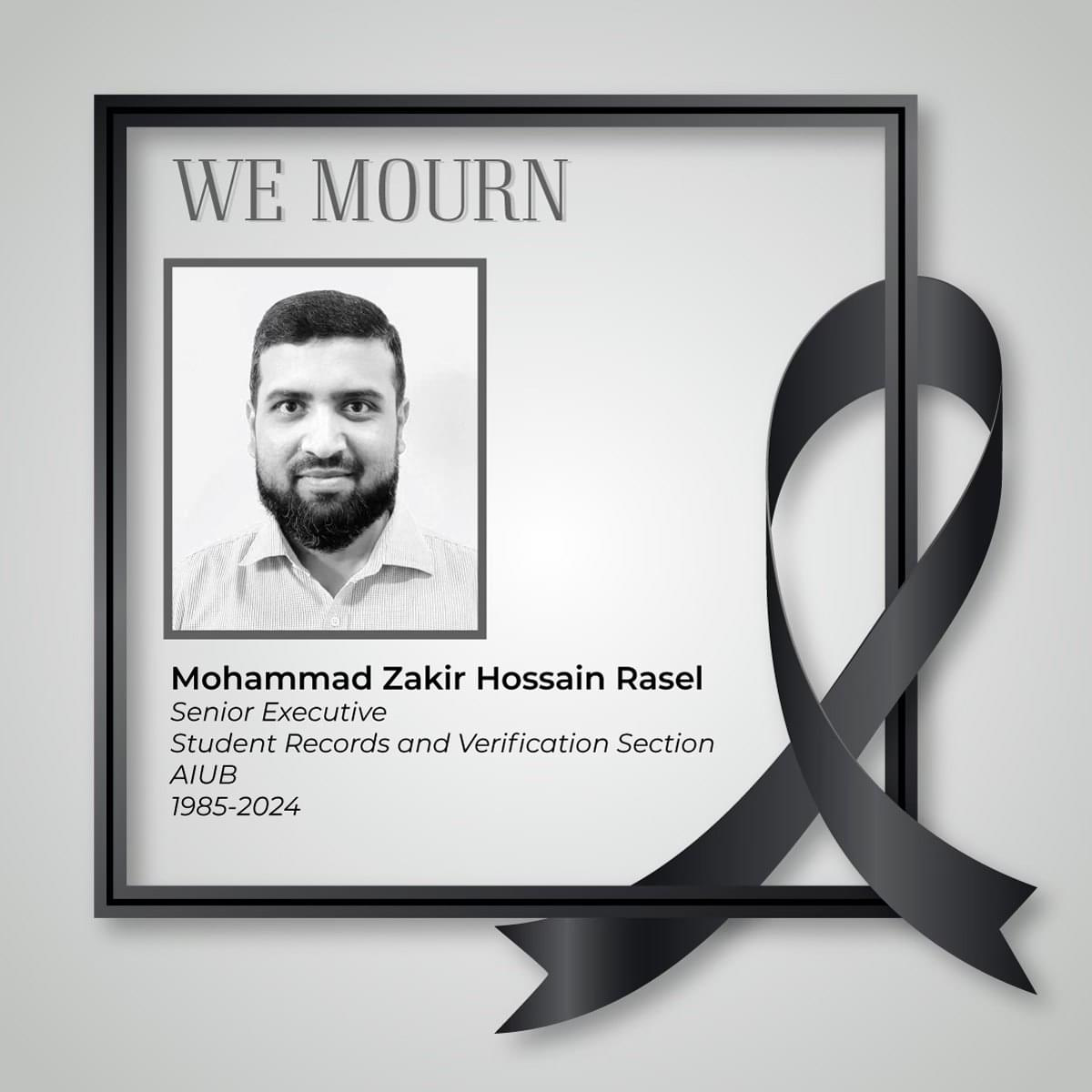 Our deepest sympathies and heartfelt condolences to the family of 𝗠𝗿. 𝗠𝗼𝗵𝗮𝗺𝗺𝗮𝗱 𝗭𝗮𝗸𝗶𝗿 𝗛𝗼𝘀𝘀𝗮𝗶𝗻 𝗥𝗮𝘀𝗲𝗹, Senior Executive, Student Records and Verification Section, AIUB, who passed away on Monday, 1 April 2024 after battling with cancer.