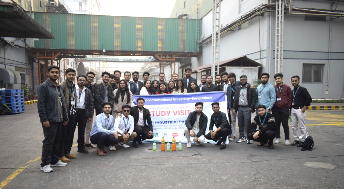 The Department of Marketing, Faculty of Business Administration (FBA), AIUB, organized a plant visit to RFL Industrial Park (RIP), PRAN-RFL Group, Kaliganj, Gazipur on Saturday, January 04, 2025. As a part of the regular student development program under the industry-academia collaboration, BBA Marketing specialization students from the courses of ‘Sales Management’ and ‘Product Innovation and Management’ went on to visit the plant to get practical insights about the factory operations, production processes, quality control, and storage & shipment procedures of the PRAN foods and beverage items in the home and foreign markets.