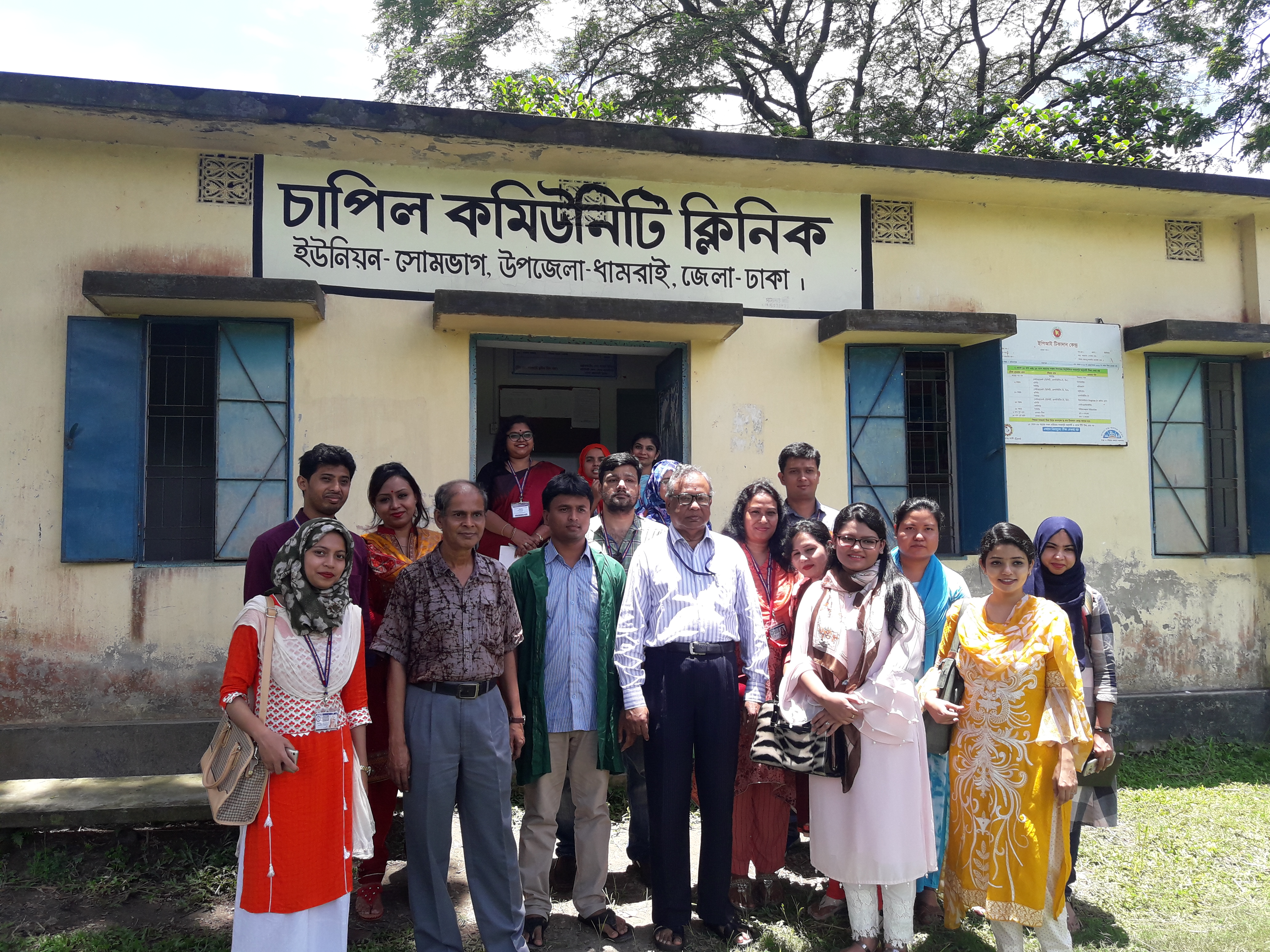 To understand the health system and public health in rural Bangladesh, AIUB students of Masters of Public Health (MPH) department organized a field visit to Dhamrai Upazila Health Complex, Union Health Complex, and Chapil Community Clinic and Sombhag Union Health and Family welfare center located at Dhamrai, Dhaka to explore locals’ participation in health services through personal interviews as well as case studies. The field visit started in the morning around 8:00 am from the university premises and students were accompanied by Dr.A. N Neaz Ahmad Advisor and Professor, Dr. Pradip Sen Gupta Adjacent Faculty and Ms. Monidipa Saha Program Officer The objectives of the visit is, • To understand the program functioning and management of Upazila Health Complex,Union Health complex and Community Clinics of Bangladesh. • To support students to learn hands-on in order to understand the public health status of Bangladesh. The Government provides healthcare services to its rural people through health facilities at a smallest administrative unit called Upazila Health Complex (UHC). UHC provides outpatient care, primary healthcare, family-planning services, and other preventive healthcare services to the community. MPH students were briefly introduced to the Dhamrai Health Care facility by Dr.Iqbal Kabir (FR),Ms. Tania Parvin (UFPO), Ms.Momtaj Akhter (AUFPO). Ms.Momtaj Akhter showed us their working areas, training schemes and then explained work procedures which includes maternal and child care, vaccinations, ANC, PNC services along with health education campaign on pregnancy care, family planning, Contraceptives distribution etc. They also provide 24/7 days support to pregnant women. UHCs represent 31% of the government health sector, signifying their importance as a major contributor to healthcare service in Bangladesh. Medical graduates, along with the paramedics and nurses supported by personnel for laboratory services and supplies, are responsible for healthcare services provided by the UHC. After visiting UHC, students visited Chapil Community Health Clinic.MPH students get to know about Community Clinic through Mr. Shams Uddin, a community health clinic provider. He describes MCH-FP services through home visits, EOC services with provision of Skilled Birth Attendants (SBA), Antenatal screening, PNCs, referral methods for safe delivery, contraceptive supply (pill and condom) etc. He mentioned that many non-governmental organizations (NGOs) also provide healthcare services through community clinics. Through him students got to know that, UHCs are also the referral centers for a number of grassroots-level community clinics. Bangladesh is on track in terms of achieving MDG targets particularly MDG 4 & 5. In order to reduce fertility rate, mortality rate, Neonatal mortality rate and further Infant Mortality UHC and CC are playing a strong role achieving development goals. Through this visit MPH students gained in-depth knowledge about the existing health services and helped them determining the goals in Bangladesh. The field visit helped them to be aware about formulated policies to ensure essential services, strategies to ensure hospital-based services for localities, structural design planned for human resource development and also to gain integrated knowledge of NGOs and the Private Sector and of plans for resources and utilization of funds in Bangladesh.