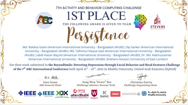 The AIUB team, named Team Persistence, participated in the BeyondSmile2025 challenge titled “A Challenge on Detecting Depression through Facial Behaviors and Head Gestures.” The team members from AIUB included 4 students from CSE department: Md. Rakibul Islam, Dip Sarker, Md. Tafhimul Haque Sadi, Labib Hasan Bayzid. They were supervised by Dr. Md. Kabiruzzaman (Assistant Professor, Department of EEE, AIUB), and Dr. Shahera Hossain (University of East London, UK).