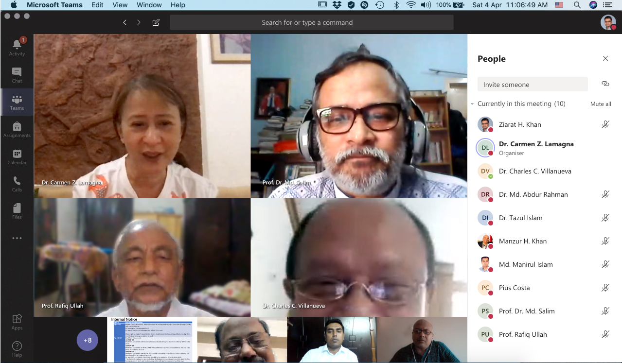 AIUB achieves yet another milestone! On Saturday, April 4, 2020 at 11 AM, the 44th Syndicate Meeting of AIUB was held virtually on the Microsoft Teams online platform. Dr. Carmen Z Lamagna, Vice Chancellor of AIUB presided over the virtual meeting in presence of other members of Syndicate, Prof. Dr. Md. Rafique Ullah, Prof. Dr. Md. Selim, Prof. Dr. Charles C. Villanueva, Prof. Dr. Tazul Islam, Mr. Pius Costa, Prof. Dr. Md. Abdur Rahman and Mr. Manzur H. Khan. Mr. Manirul Islam and Mr. Ziarat H Khan were also present during the meeting on special invitation.