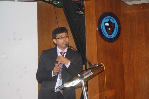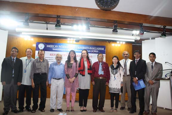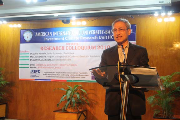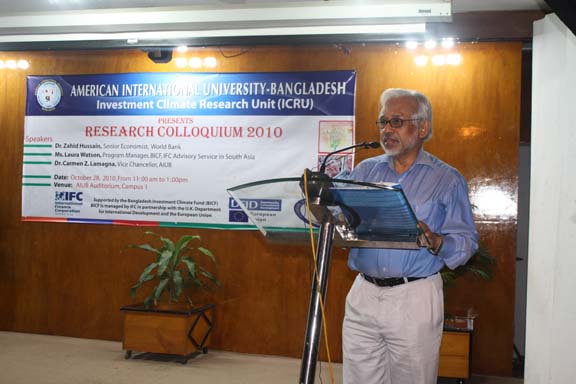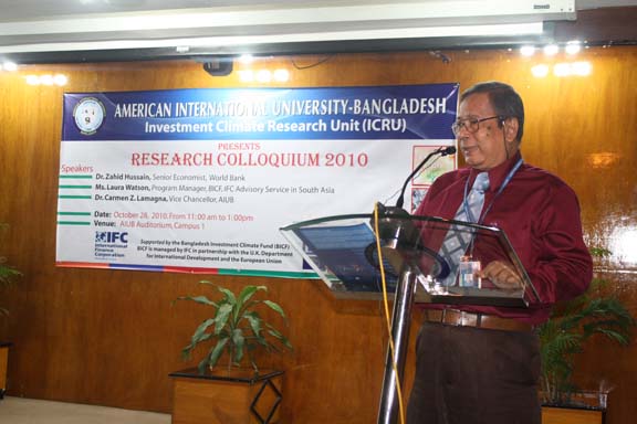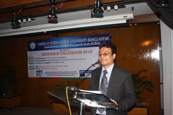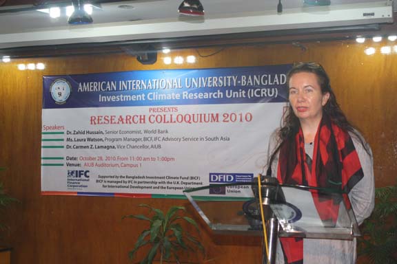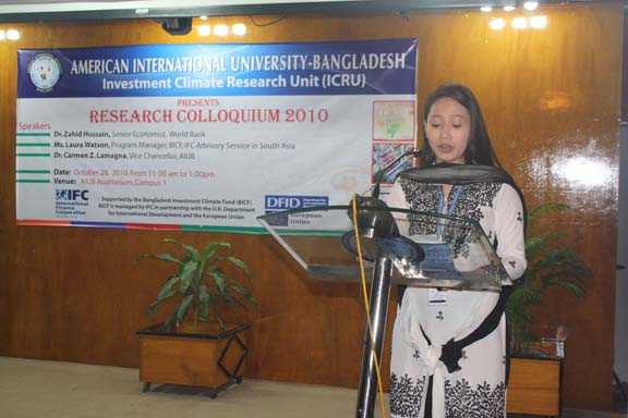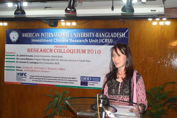 The Research Colloquium was held last 28 October 2010 in the AIUB’s Auditorium attended by participants coming from the funding organizations, from the academe particularly the 4 participating universities such as BRAC, NSU, IUB and East-West , from the government agencies, nongovernment agencies, Deans, professors of research, department heads, and key officials of AIUB. The honorable Vice Chancellor of AIUB, Dr. Carmen Z. Lamagna warmly welcomed the participants and guests. Ms. Laura Watson , Program manager of BIFC and Advisor of IFC-World Bank in south Asia delivered an address recognizing the efforts of AIUB in undertaking this laudable event. Dr. Zahid Hossain, one of the special guests, a Senior Economist of World Bank underscored the importance of the researches as these are valuable inputs to the government policy formulation effort to create conducive investment climate of the country and to concerned international organizations to design interventions in promoting the same thrust. He further informed the audience that the country is on its right path to surpass its GDP target. The UGC is represented by Prof. Muhibur Rahman who has a rich and wide experience in field of research. He emphasized the cultivation of research in the universities. Every presentation by the researcher was followed by intellectual exchange allowing the participants to interact and raise questions and observation to clarify issues emerging from the research. The 2- hour colloquium was capped with the brief recapitulation of the 3 researches by Prof. Anwar Hossain. The expression of profound thanks and grateful appreciation was conveyed by Ms. Dulce Lamagna, Executive Secretary of the ICRU. The colloquium ended with bright prospects for future research and other related interventions for the academe to continue its role in promoting investment climate in Bangladesh .