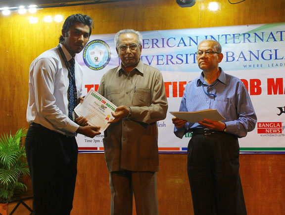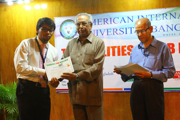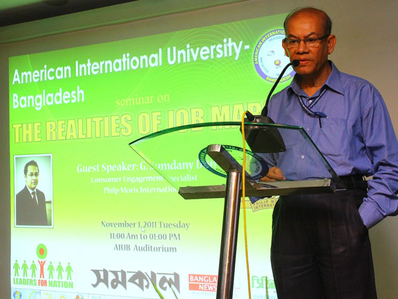 A seminar titled “The Realities of Job Market” was organized by LEADER FOR NATION on the 1st of November, 2011 in the auditorium at 11am. The Vice President of Academics, Prof. Dr. Tafazzal Hossain delivered a welcome speech. The Dean of Engineering Prof. Dr. ABM Siddique Hossain & Dean of Business Administration Dr. Charles C. Villanueva with their valuable words humor enlightened the audience. Dr. Charles expressed his surprise when he found out about the great achievements of LEADER FOR NATION. He wished the organization that it would prosper and finally become an international organization in the near future. The Director of O.P.A (Office of Placement & Alumni) Mr. Tareq Moudud and Director of OSA, Mr. Manzur H Khan also gave short speeches on the occasion. Finally the Founder, President LEADER FOR NATION, student of EEE (11th Semester) Mr. Tanvir Rahman gave thanks to everyone and handed over the mike to the Guest speaker of the seminar Mr. G. Sumdany Don, the Consumer Engagement Specialist, at Philip Morris International- Bangladesh. Mr. Don lectured the students on how to overcome the difficulties in getting a job. He conducted his remarkable presentation with his imaginary friend “Fahad” where he showed various slides on requirements of different job opportunities. The main goal of this seminar was to prepare students for AIUB Job Fair 2011 that will be held on the 19th of November where participating companies will collect CVs.