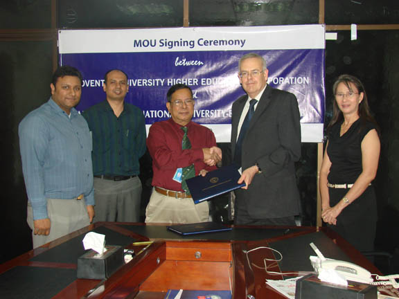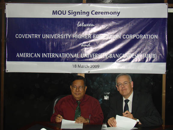 American International University-Bangladesh (AIUB) signed a Memorandum of Understanding with Coventry University, UK at the Board Room of AIUB on Wednesday March 18, 2009. The MOU provides scope for establishing 2+2, and 3+1 programme frameworks for courses in the area of Business, Environment and Society, undertaking joint research and exchange of faculty and students as well as credit transfer.