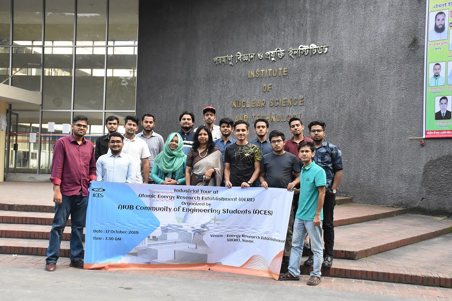 On 17th October, 2019 AIUB Community of Engineering Students (ACES) organized an industrial tour at Atomic Energy Research Establishment (AERE) which is located at Ganakbari, Savar, Dhaka. AERE was established on 1975. It is a major research establishment of Bangladesh Atomic Energy Commission (BAEC) whose main aim is to carry out research and development (R&D) activities in nuclear science and technology for eco-friendly utilization of nuclear energy for socio-economic development of Bangladesh. A group of 16 students with a faculty member of AIUB visited the institute. The team was led by Prof. Dr. Afroza Shelley (Professor of School of Natural Science (Physics), AIUB). The team departed from the Kuril Bishwa Road at 9:00 a.m. and reached the power plant at 10:30 a.m.