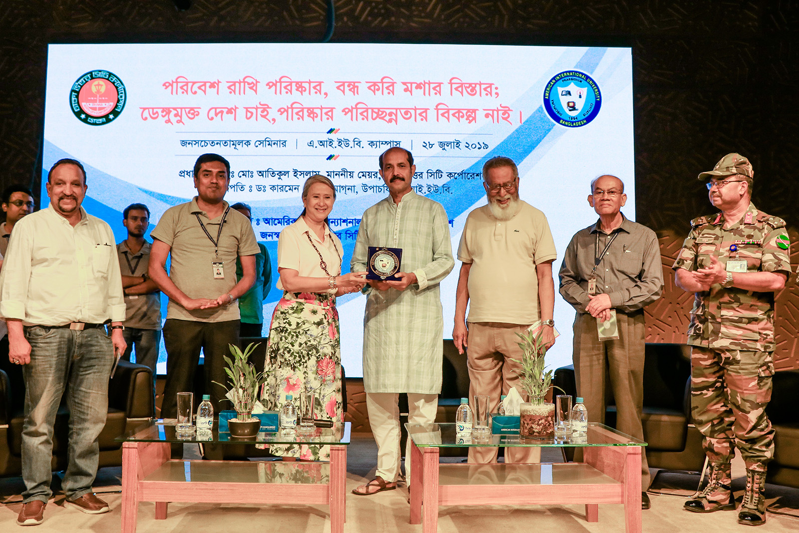 The Honorable Mayor provided valuable insights regarding the measures to be taken to reduce the breeding of aedes mosquitoes, the carrier of Dengue and Chikungunya disease. He urged the students of AIUB, to spread public awareness and to reach out to their community regarding the prevention of breeding and reproduction of the aedes mosquitoes. The Chief Health Officer, DNCC, Brig. General Mominur Rahman Mamun and the local ward commissioner, Dr. Zinnat Ali delivered their views on the topic. University officials, teachers, students, representatives of the local government, and members of the community attended the seminar.