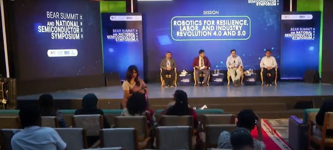 The inaugural BioTech, Electronics, AI, and Robotics (BEAR) summit was held at the National Science and Technology Complex on July 16, 2025. The BEAR summit and the associated Semiconductor Symposium were unique as academicians, local industry stalwarts, and leaders of the top global tech companies came together to discuss the status and prospects of the BEAR and semiconductor fields in Bangladesh. A panel discussion titled Robotics for Resilience, Labor, and Industry Revolution 4.0 and 5.0 was held in the afternoon session. Dr. Ebad Zahir, Senior Assistant Professor, Department of Electrical & Electronic Engineering, AIUB, participated in the discussion as one of the panelists. The panel also included Dr. Md Akhtaruzzaman, Assistant Professor, Department of Computer Science & Engineering, BUET, and Dr. Mohammad Ariful Haque, Professor, Department of Electrical and Electronics Engineering, BUET. The panel was moderated by Dr. Shahnewaz Siddique, Associate Professor, Department of Electrical and Computer Engineering, North South University.