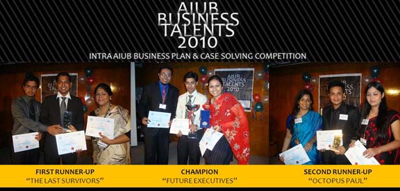The Grand Finale of ABT 2010 was held on August 16, 2010 in AIUB Auditorium. The 4 finalist teams came up with details business proposal that covered marketing strategy, financial analysis, organizational structure, human resource plan, etc. After a hard-hitting judgment by the faculty members and outstanding performance by the participants ‘The Future Executives’ was chosen as the Champion of ABT 2010 followed by ‘The Last Survivors’ who was chosen as 1st Runner-up and ‘The Octopus Paul’ as the 2nd Runner-up. Tasnova Khan was selected as the Best Performer of the competition.