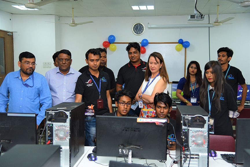 A crowd of excited players flooded the campus, whose overwhelming response marked the incredible enthusiasm at the Opening Ceremony of the event. The Vice Chancellor, Dr. Carmen Z. Lamagna, and the Founder & Vice President of Student Affairs, Ms. Nadia Anwar, inaugurated the program together, where the Vice President of Academics and the Dean of FSIT, Prof. Dr. Tafazzal Hossain, the Program Director, Mr. Mashiour Rahman, the Head for the Undergraduate Programs, Dr. Dip Nandi, the Head for the Graduate Programs, Dr. Tabin Hasan, along with several other faculty members and administrative officers were present. The first day was reserved for the participants from Grades V to XIII for playing NFS Most Wanted and FIFA 2018. BYTES was the youth engagement partner for the event, while The Daily Star & The Daily Jugantor provided the media coverage as the online and news partners, with Channel i as the TV partner, and Radio Shadhin as the radio partner, throughout the entire program.