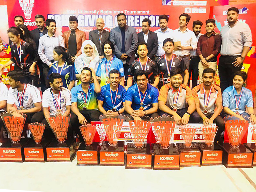 AIUB faculty admin badminton doubles team including Mehedi Kayser Pabitra, a faculty from English department and Emran Hossain, an executive from admission office, clinched a convincing victory against East West univeristy faculty team to defend their championship at the 4th EWU WINTER SMASH 2019 sponsored by Pran KRAKO and organized by East West University Sports Club. This prestigious nationwide badminton competition was held from the 15th February to the 18th February at East West University campus, Aftabnagar, Dhaka.
