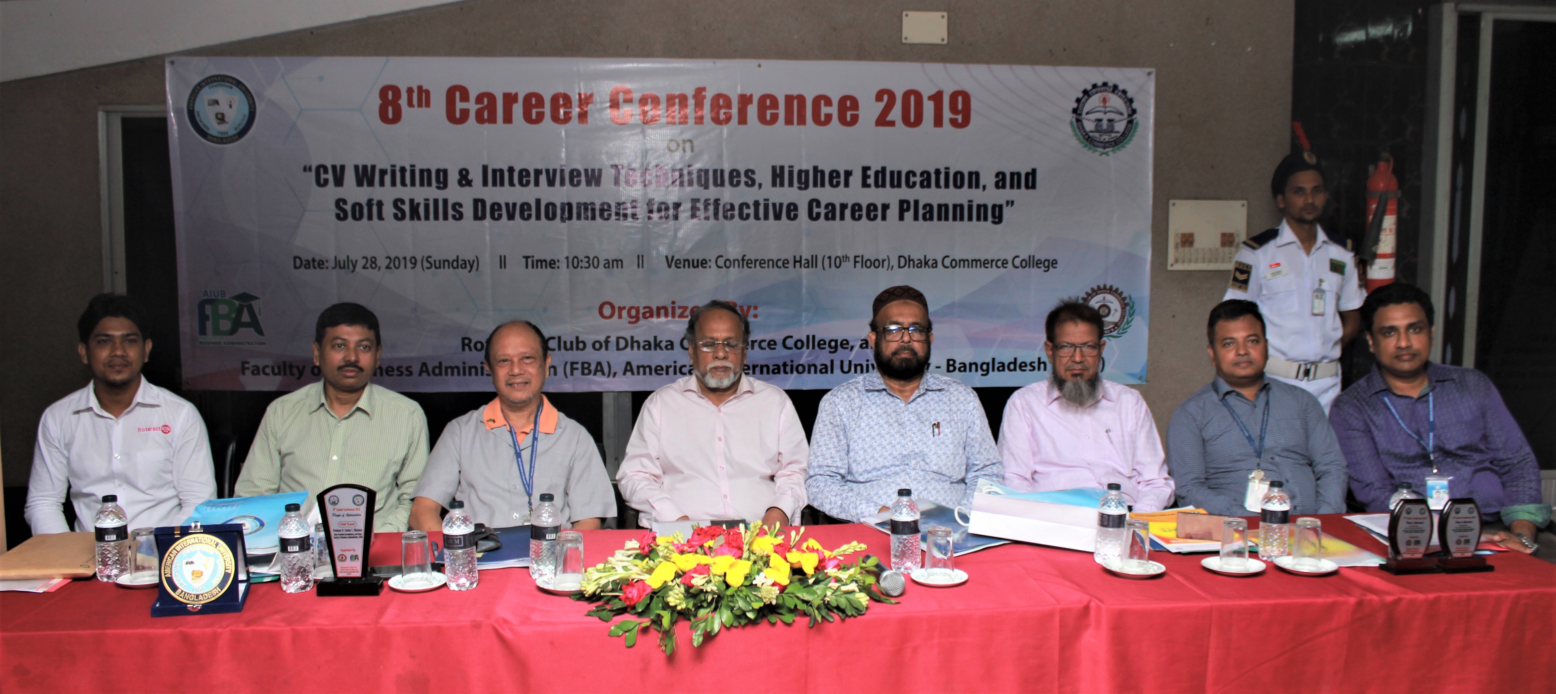 The Faculty of Business Administration (FBA), AIUB facilitated the “8th Career Conferences 2019”, organized by the Rotaract Club of Dhaka Commerce College (DCC). Under the Lead of Prof. Dr. Charles C. Villanueva, VP-Academics & Dean, FBA, 5 Resource Persons delivered lectures on “CV Writing & Interview Techniques, Factors Affecting the Choice of Career, and Soft Skills Development for Effective Career Planning”. A quiz competition was also conducted to find out how retentive were the students in listening to the lectures and demonstrations of the resource persons composed of the following: Dr. Shibli Ahmed Khan, Department of Management; Md. Asif Kamal, Department of English; Md. Mehzabul Haque Nahid, Department of MIS; Mohammad Faridul Alam, Department of Accounting; Stanley Rodrick, Department of Marketing and Hamidul Islam, Department of Marketing, alumnus of the DCC and the coordinator of the event along with S.M. Ali Azam, convener cultural event of DCC.