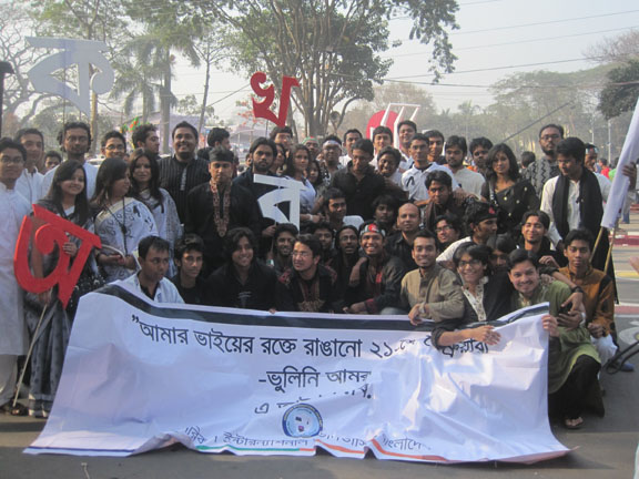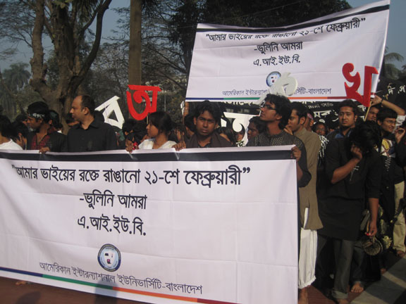 This year AIUB under the banner of all the Student Clubs participated with the rest of the country to pay homage to these brave souls of our Language Movement. The procession reached the Central Shaheed Minar at dawn and paid their respect with flowers and by observing a minute of silence. Director, Office of Student Affairs Mr. Manzur H. Khan accompanied the students. It was definitely a procession with a difference where students not only carried a banner like everyone else but what made them stand out in the crowd was the different alphabets they carried of our beloved Mother Tongue – BANGLA.