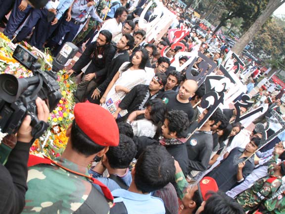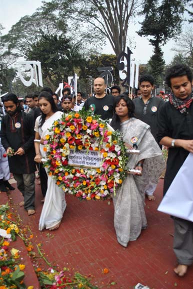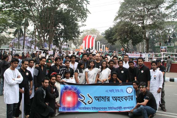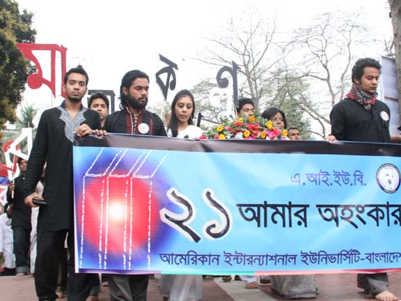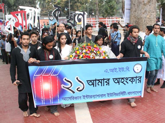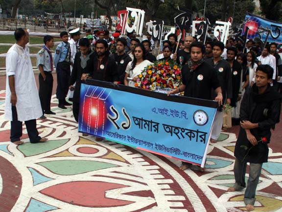 On 21st February 2011, all student clubs of AIUB with the support of the Office of Student Affairs participated with the rest of the country to pay homage to the brave souls of our Language Movement in 1952. At dawn, members of AIUB Drama Club, AIUB Performing Arts Club, AIUB Arts Club, AIUB Film Club, AIUB Social Welfare Club- Shomoy, AIUB Photography Club, AIUB Business Club gathered at ‘Polashir Mor’ and started the procession towards the Shaheed Minar. Mr. Manzur H Khan, Director, Office of Student Affairs accompanied the students. AIUB Arts Club prepared different alphabets of our beloved mother tongue ‘Bangla’ in different colors that gave the whole procession a unique look.