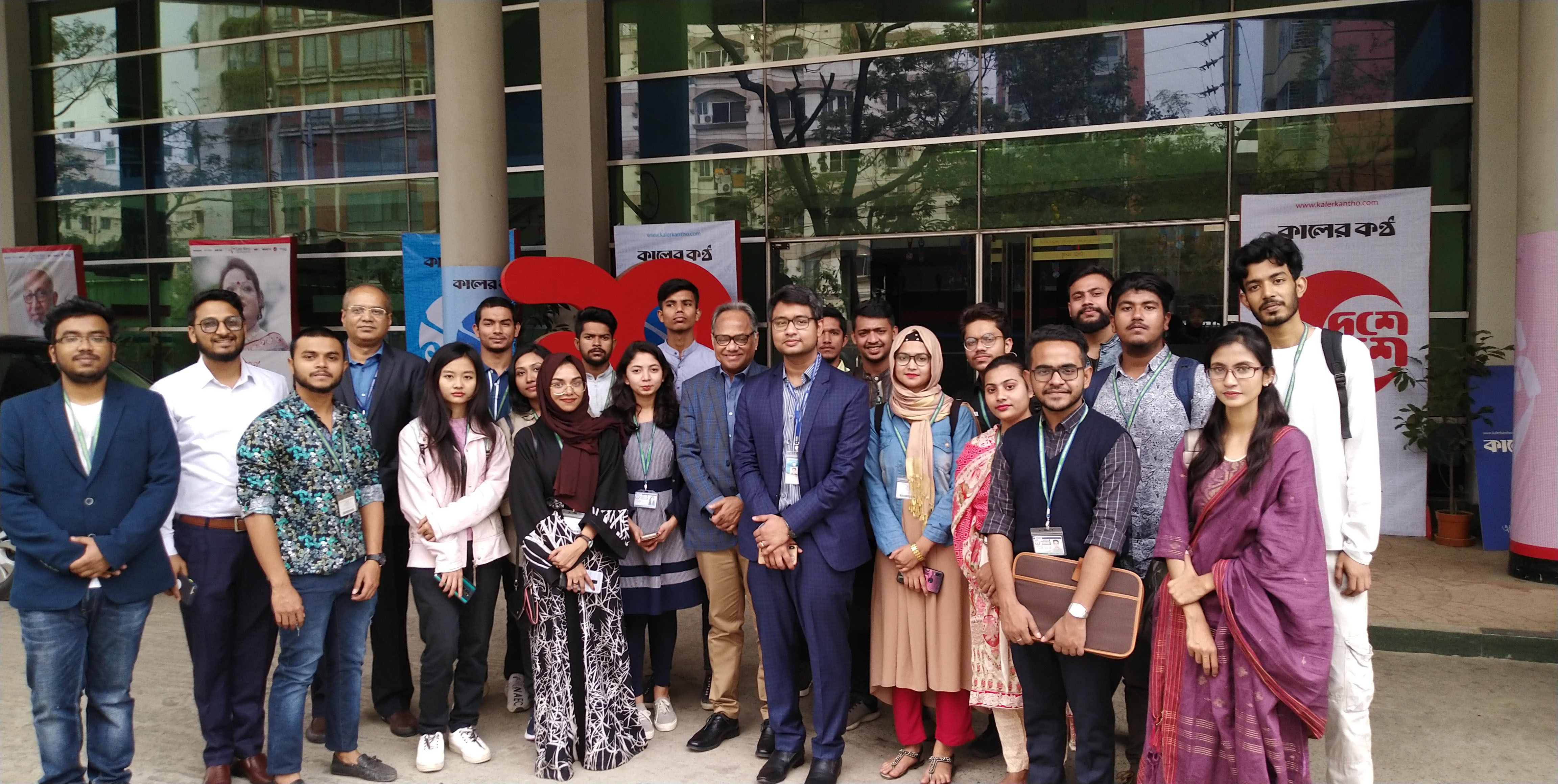 Recently American International University-Bangladesh (AIUB) students visited the East West Media Head Office at Bashundhara. The Twenty five students, all from the Business Communication course of the Faculty of Business Administration, were briefed by prominent media personalities including Mr. Naem Nizam, Editor, Bangladesh Pratidin, Mr. Imdadul Haq Milan, Editor, Kaler Kantho, Ms. Shahnaz Munni, Chief News Editor, News24 TV about different issues including ethical news reporting, operations of the print and broadcast media, job opportunities in the media and challenges faced by the traditional media. Students observed the live broadcast of news from within the studio and later appeared live on the FM radio 94.8. The students were accompanied by Dr. Shiblil Ahmed Khan and Mr. Mahir Abrar, course instructors of Business Communication.
