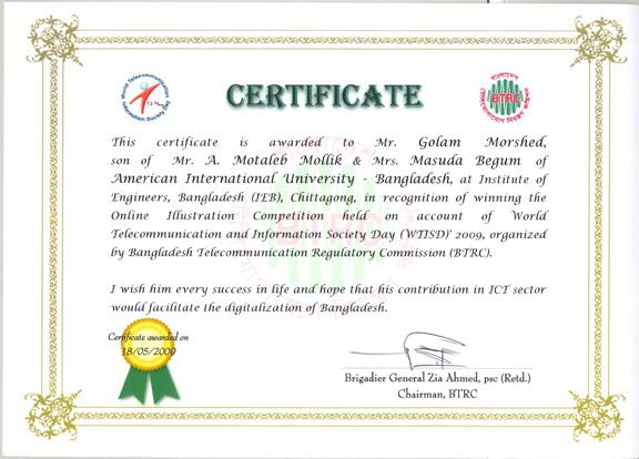 The Bangladesh Telecommunication Regulatory Commission (BTRC) in celebration of World Telecommunication and Information Society Day (WTISD) has arranged a competition on “Illustration on Digital Bangladesh with a Slogan”. AIUB participated in the said event with our very own Mr. Golam Morshed of VUES department and won the professional category. The awarding ceremony was held at Institute of Engineers, Bangladesh (IEB) Chittagong, the prizes was presented by the Honorable Minister, Minister of Post & Telecommunications (MoPT), Mr. Raziuddin Ahmed Razu |