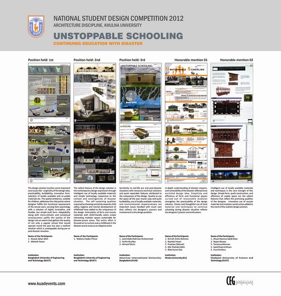 The Architecture Discipline of Khulna University (KUAD) in September 2012 organized National Student Design Competition 2012, with the topic “UNSTOPPABLE SCHOOLING, continuing education with disaster”. Architecture students around the country were invited to design innovative school form/facilities which could be portable in nature. The use of reusable, readily available materials was key. The competition asked for designs that facilitate school children, secure necessary school books, a solution that might be helpful to resume schooling if an adequate sized dry piece of land is found or not.