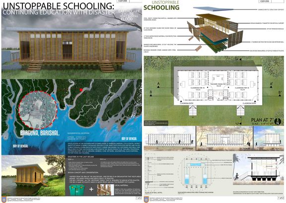 As part of the competition entrants were to propose design scenario and strategies for building a flexible facility that will help shorten the time to restart schooling after disaster on a temporary basis. Their idea focused majorly on the use of local material Bamboo and Shelter box from aid agencies, a collaboration of plastic Shelter box & Bamboo Raft, the built school can achieve the property of floating on water following necessary instructions during construction. The Use of bamboo as major building material, the local expertise and availability can be used to construct the design elements in the fastest pace for uninterrupted education.