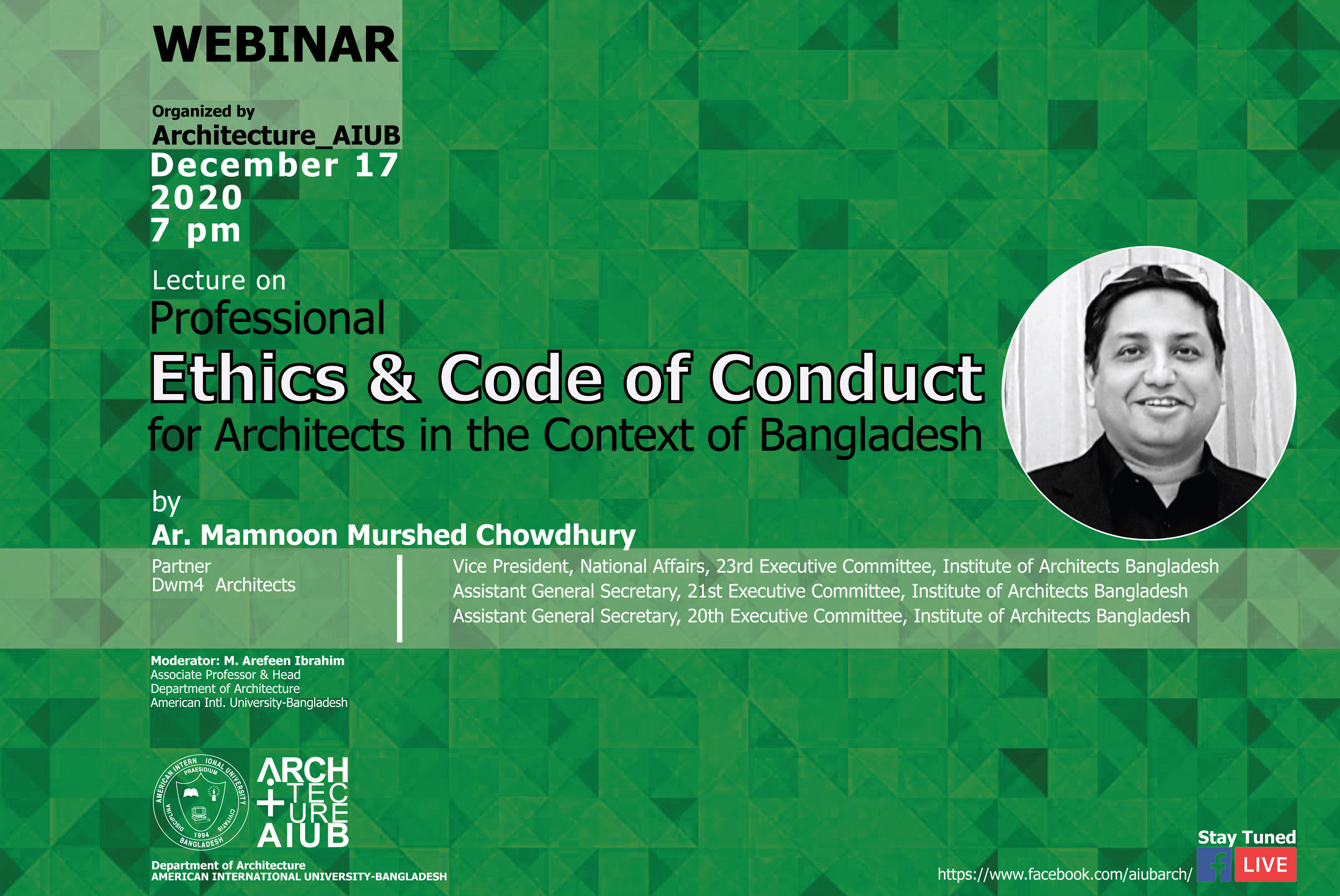 The Department of Architecture, AIUB organized a webinar on Dec 17, 2020 at 7 pm. The webinar titled “Professional ethics and code of conduct for Architects in the context of Bangladesh’’ was organized for the students and faculty members of the Department of Architecture.