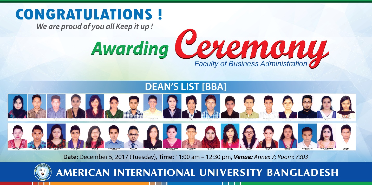 There were 36 BBA students who successfully met the criteria while 61 from the MBA and 13 from EMBA. It was a significant event in the lives of these students to be recognized and awarded a Certificate of Recognition. They can use these certificates as a proof of their academic excellence whenever they will apply for a job or pursue higher studies. In addition to the welcome and inspirational message of the Dean, Prof. Dr. Charles c. Villanueva, a representative from the each categories delivered a response message and also an inspirational message from one of the alumni who was also a Dean’s Lister and an Honorable mention Lister. Both expressed their deep appreciation for the honor bestowed on them and encourage the other awardees to continue excelling in their studies. Likewise a reminder to express gratitude to the parents for their sustainable support in their studies and the faculty who are the sources of knowledge and other learning domains in their studies was expressed by the Director of the MBA program . The event was made more significant with the presence of Prof. Dr. Md. Rafique Ullah, Dean, Faculty of Engineering and honorable member of AIUB’s Syndicate as the Chief Guest during the awarding ceremony for the Honorable Mention Awardees. His words of wisdom have truly inspired the awardees to continue their excellent academic performance. Ms. Farheen Hassan concluded the program with a vote of thanks to the students, faculty and management for a successful and an event to remember. CONGRATULATIONS AND FBA IS PROUD OF YOU ALL !