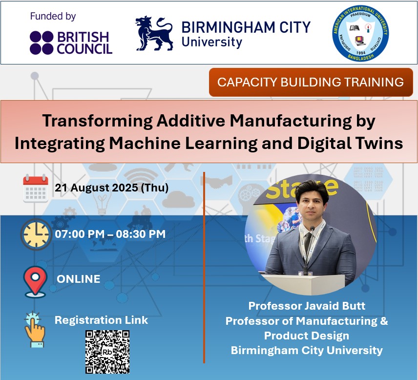 On Thursday, August 21, 2025, the American International University-Bangladesh (AIUB), in collaboration with Birmingham City University (BCU), UK, successfully organized a capacity-building training session on “Transforming Additive Manufacturing by Integrating Machine Learning and Digital Twins.” The program was conducted under the British Council funded Transnational Education (TNE) Exploratory Grant project, titled “Developing an international professional certification program for digital manufacturing at AIUB”.