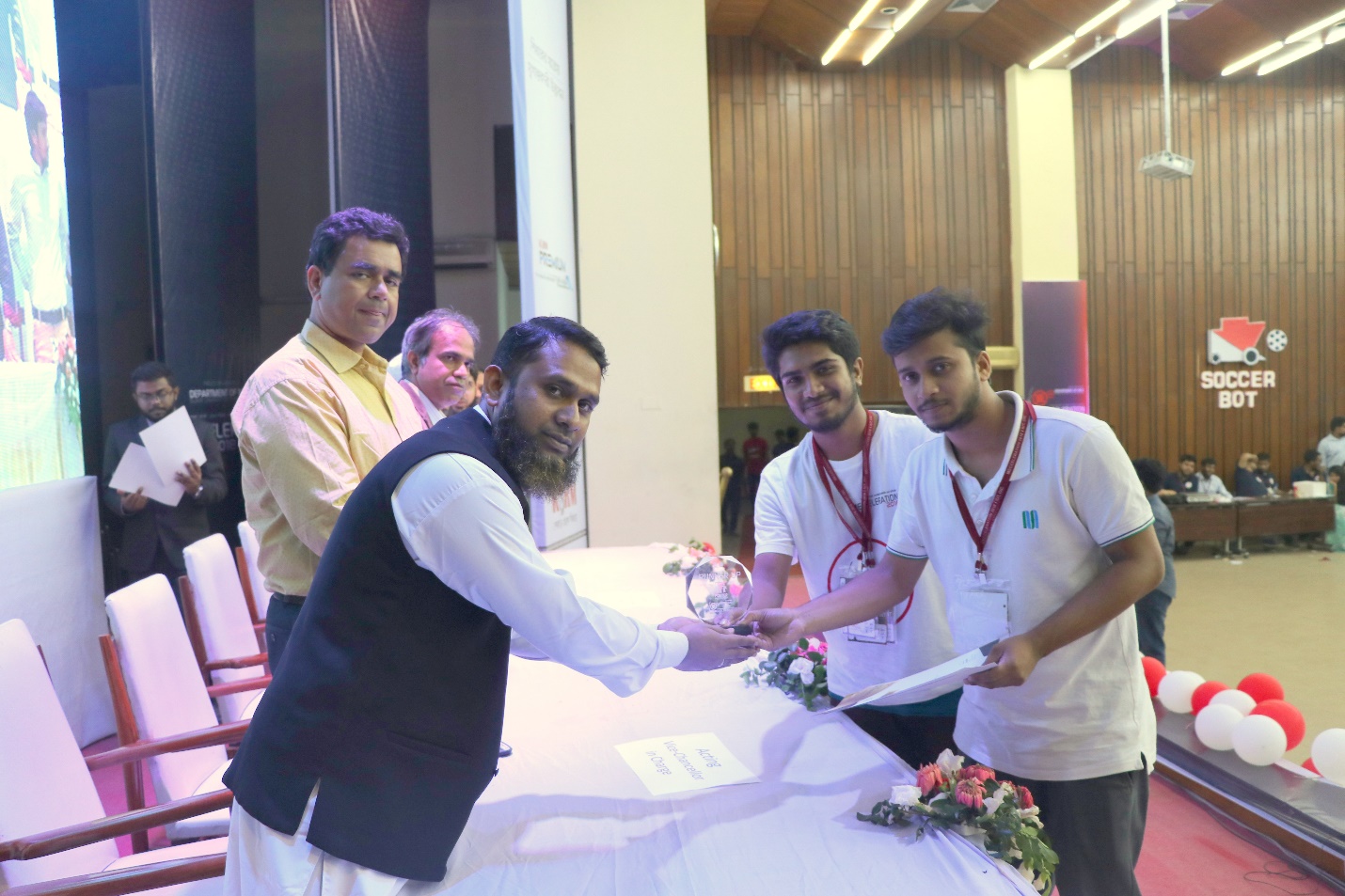 Team “Hyper Robotics” formed by students from Department of Computer Engineering (CoE) and Electrical & Electronic Engineering (EEE), AIUB became runners-up in poster presentation at Mecceleration’18. This techfest was organized by the Department of Mechanical and Chemical Engineering (MCE) of the Islamic University of Technology (IUT). Exciting and brain storming events like Line Following Robot, Project Showcasing, Business Idea Challenge, General Knowledge Competition, Engineering Olympiad, Poster Presentation, Engineering Symposium and CAD Competition were the main attractions of the day. Participants from different academic institutions contested in poster presentation. Among them Team “Hyper Robotics” became runners up for their poster presentation on Hexapod Robot. Members of Team “Hyper Robotics” are Md. Imran Uddin (Student, Dept. of CoE) and Md. Shahriar Alamgir (Student, Dept. of EEE). Both of them were awarded by crest and certificates for their extraordinary performances in poster presentation.