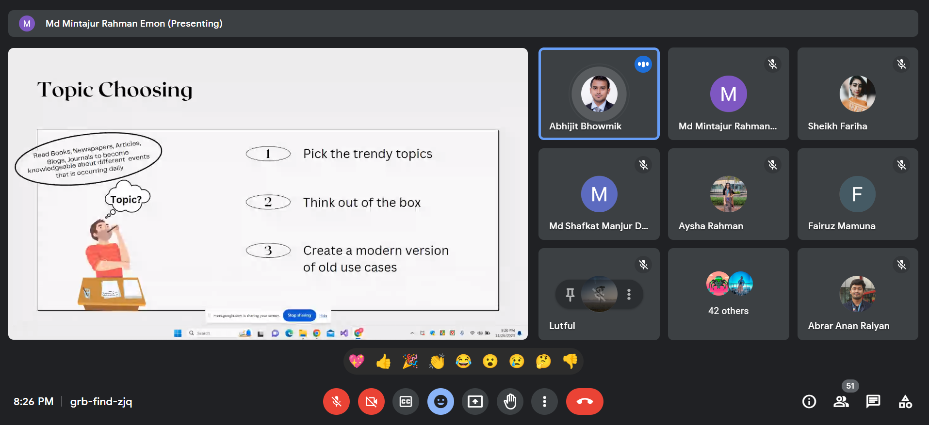 The main purpose of the workshop was to provide students with the opportunity to learn the fundamental skills they need to write well both in academic and day-to-day life. The speaker began the session by showing the agendas of the workshop and started with the introduction of the content writing, pillars of content writing, examples and structures, brainstorming, feedback approach, summary, and action items. He explained the importance of effective communication and dynamic content to make sure the message is delivered to the audience clearly. He encouraged everyone to think out of the box to create modern versions of old use cases. Additionally, Abhijit Bhowmik (Associate Professor of CSE at AIUB and Special Assistant, Office of Student Affairs) joined the meeting and inspired the audience to focus more on content writing skills and appreciated the workshop for its purpose. Mr. Mintajur then highlighted four considerable pillars of content writing. He continued by talking about the examples of contents and their structure. Then he briefly discussed how to write social media captions, reports, press releases, article, thesis and explained how the content should be structured. The speaker also talked about how a writer might use digital brainstorming to collect fresh, impactful ideas that will appeal to a certain audience. Later, he discussed how the feedback strategy will connect the audience with the work and aid in understanding their needs. He then inquired about the platform that the audience used to compose their articles.