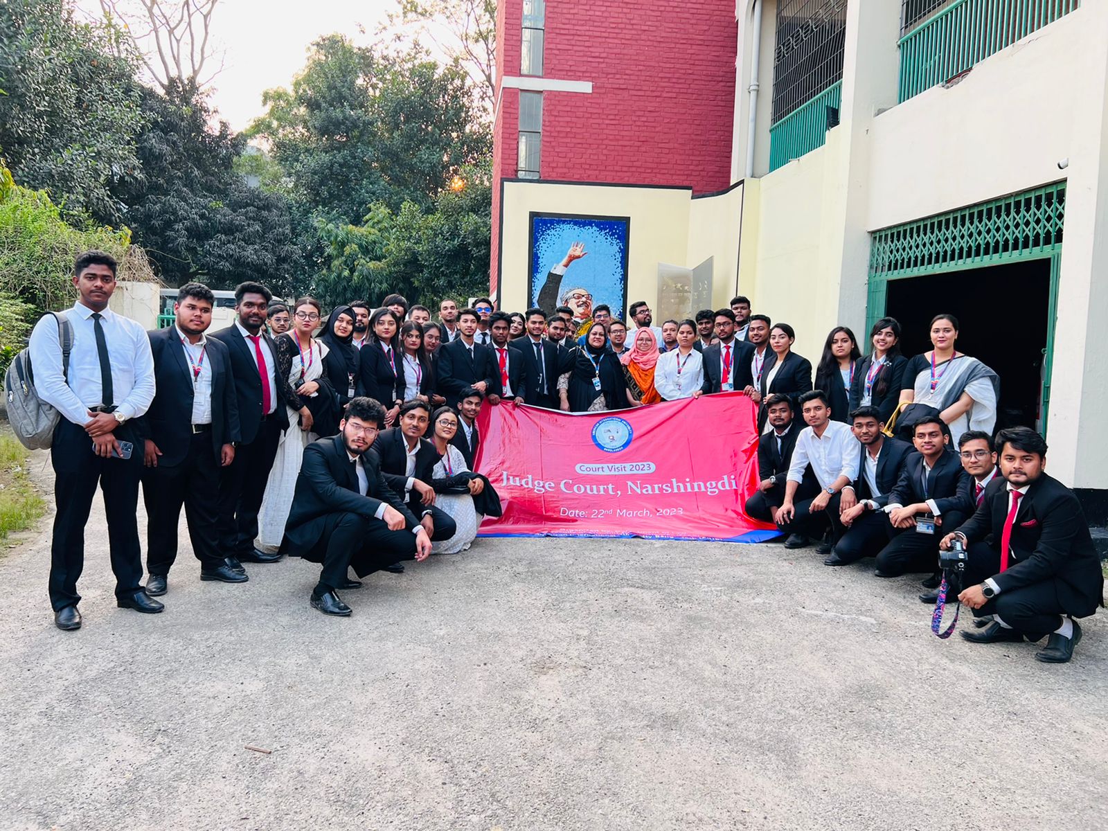 The AIUB Department of Law organized a court visit to the Narsingdi District and Sessions Judge Court on March 22, 2023, so that the students can learn more about the real-life practices of “Trial Procedure of Civil & Criminal Courts”. A group of 50 AIUB law students from 2nd semester along with faculty members (Dr. Syeda Afroza Zerin, Dr. Mohammad Abu Taher and Mr. Quazi Omar Foysal) departed from the university at 8:30 am in the morning and arrived at the Narsingdi Judge Court at approximately 10:30 am.