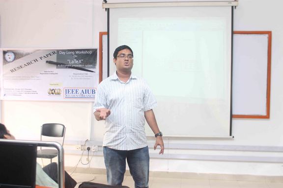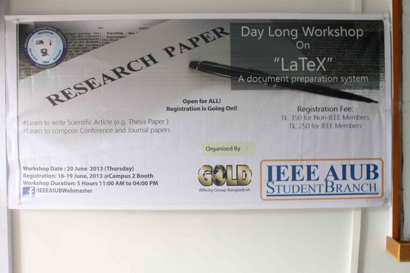 A Day Long Workshop on Latex was organized by IEEE GOLD Affinity Group & IEEE AIUB Student Branch on Thursday, 20th June, 2013 in AIUB Campus. The goal of the workshop was to introduce Latex, a high quality typesetting system, to the students and walk them through the process so that it becomes user friendly. The event was started by Laila Nawsheen Manzoor (Lecturer and Special Assistant of EEE Department), who introduced the guests and then handed over to the first guest speaker, Shuvro Chowdhury, Vice Chair, GOLD Affinity Group, IEEE BD Section. Shuvro Chowdhury started out by giving an overview of IEEE GOLD Bangladesh Chapter and its formation and further stretched on the values of IEEE GOLD. And then gave a brief overview on the history of LaTex and its merits compared to other softwares. He then introduced the software to the students and helped them get familiarize with the different features of Latex. The second guest speaker was Asif Ahmed, Treasurer, GOLD Affinity Group, IEEE BD Section, who talked about ‘Compiling a Simple Latex file’ where he introduced a Latex code, processing of Latex Document, introduced special characters on Latex, different commands writing and also implementation of different mathematical equations. The third guest speaker was Shahadat Hassan Sohel, Secretary, GOLD Affinity, IEEE BD Section, who gave an introduction to scientific writing – its purpose, audience, structure and content. He gave a thorough overview on writing a thesis book – starting from title, author, abstract to results, discussion and conclusion. The fourth guest speaker of the event was Sajid Muhaimin Choudhury, Chair, GOLD Affinity Group, IEEE BD Section, who discussed about ‘Citation and Referencing’. He discussed about the need to cite, when to cite reference, how to handle larger number of references and how to make references on Latex. He also tutored briefly on Bibtex, reference management software that complements Latex documents by managing bibliography and references. He finally called off the workshop by giving an excellent overview of the scene. The event was graced by the presence of Sayedus Salehin (Lecturer , Faculty of Engineering), Ihteaz Muhaimeen Hossain (Lecturer, Faculty of Engineering) and Md. Saniat Rahman Zishan, Asst. Prof. & Special Asst. (OSA). Proceedings went on as is customary at such events with food provided during the lunch break. At the end of the workshop certificates were given out to the attendees of the event by Sajid Muhaimin Choudhury and Shahadat Hassan Sohel. Finally Md. Abdur Rahman, Counselor of IEEE AIUB SB, Assistant Professor and Head (Undergraduate Program) of EEE department, handed over AIUB gift hampers and Certificates to the honorable speakers of the workshop. He gave the closing remarks by expressing his utmost esteem to the guests for their valuable time and effort in the program, and to the IEEE AIUB Student Branch Executive members and the volunteers for their tireless effort to make the event successful.