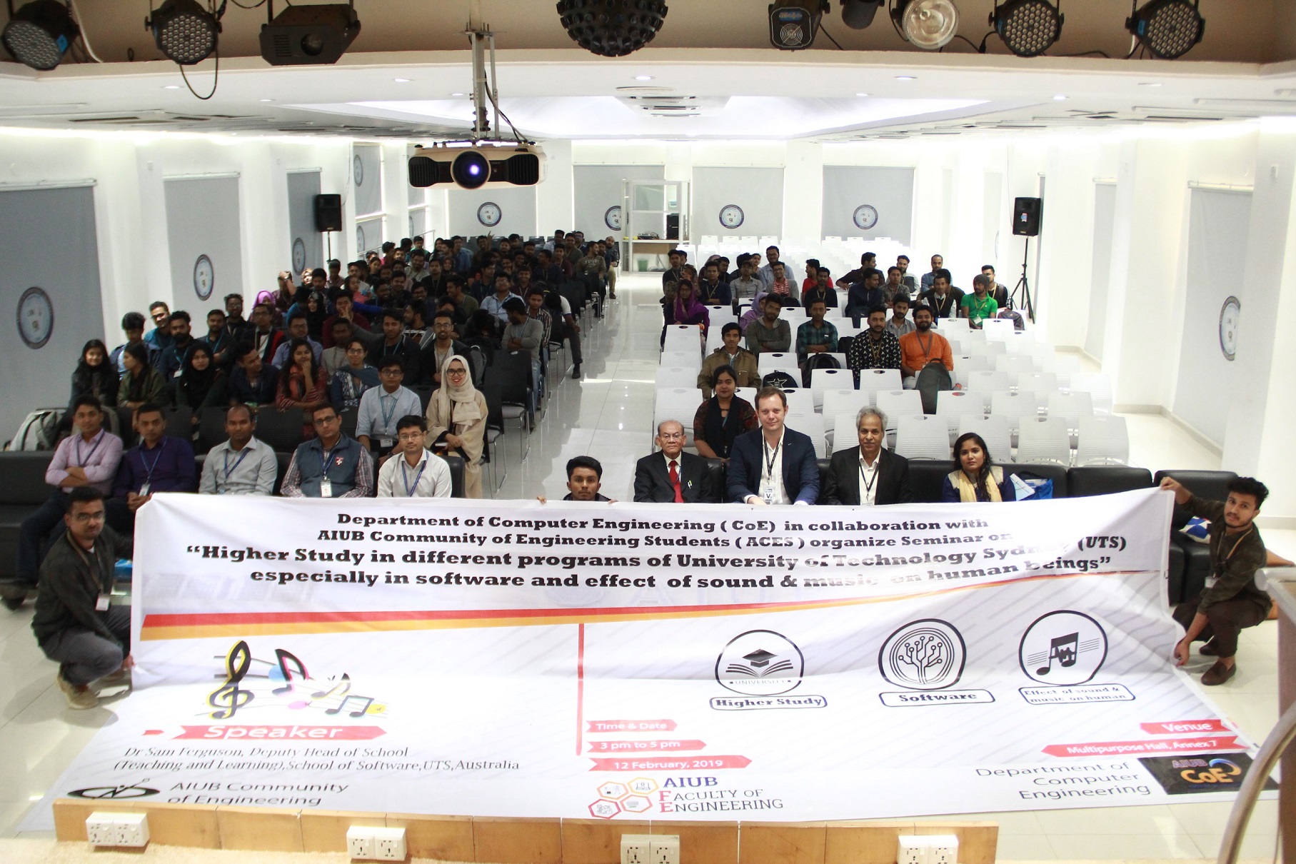 Department of Computer Engineering (CoE) in collaboration with AIUB Community of Engineering Students (ACES) organized a seminar titled “Higher Study in University of Technology Sydney (UTS)” on Tuesday (February 12, 2019) in the Multipurpose hall of AIUB. The program started at 4 PM with the participation of about 160 students belonging to various departments of the university. The objective of the seminar was to give the students all possible information about educational based programs available in the University of Technology Sydney (UTS) and discussed about viable opportunities for the students in Australia. The seminar was presented by Dr. Sam Ferguson, Deputy Head of School (Teaching and Learning), School of Software, UTS, Australia.