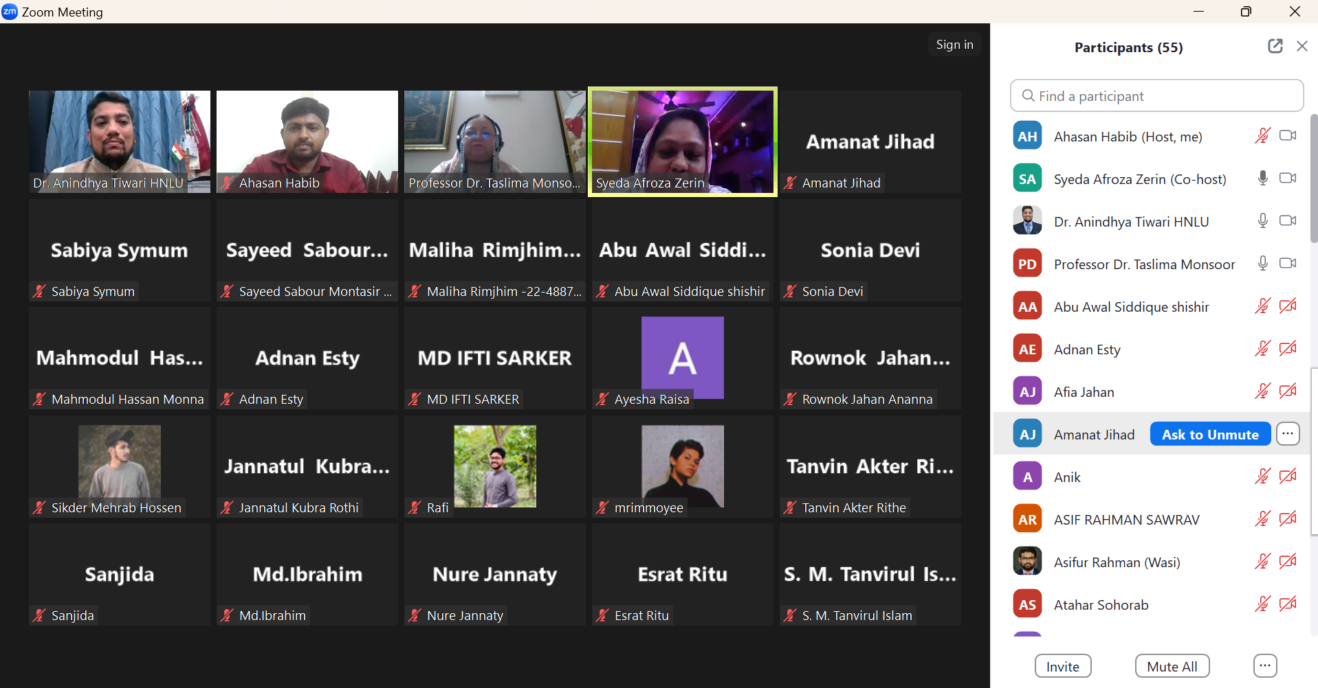 The webinar commenced with a warm welcome remark delivered by Prof. Dr. Taslima Monsoor, Adviser of the Department of Law. Her words of encouragement and support resonated with the audience, instilling a sense of enthusiasm and anticipation for the forthcoming discourse. After Dr. Tiwari's insightful presentation, Dr. Syeda Afroza Zerin, Associate Professor and Head of the Department, delivered a vote of thanks and extended heartfelt gratitude to the esteemed speaker for his invaluable contribution.