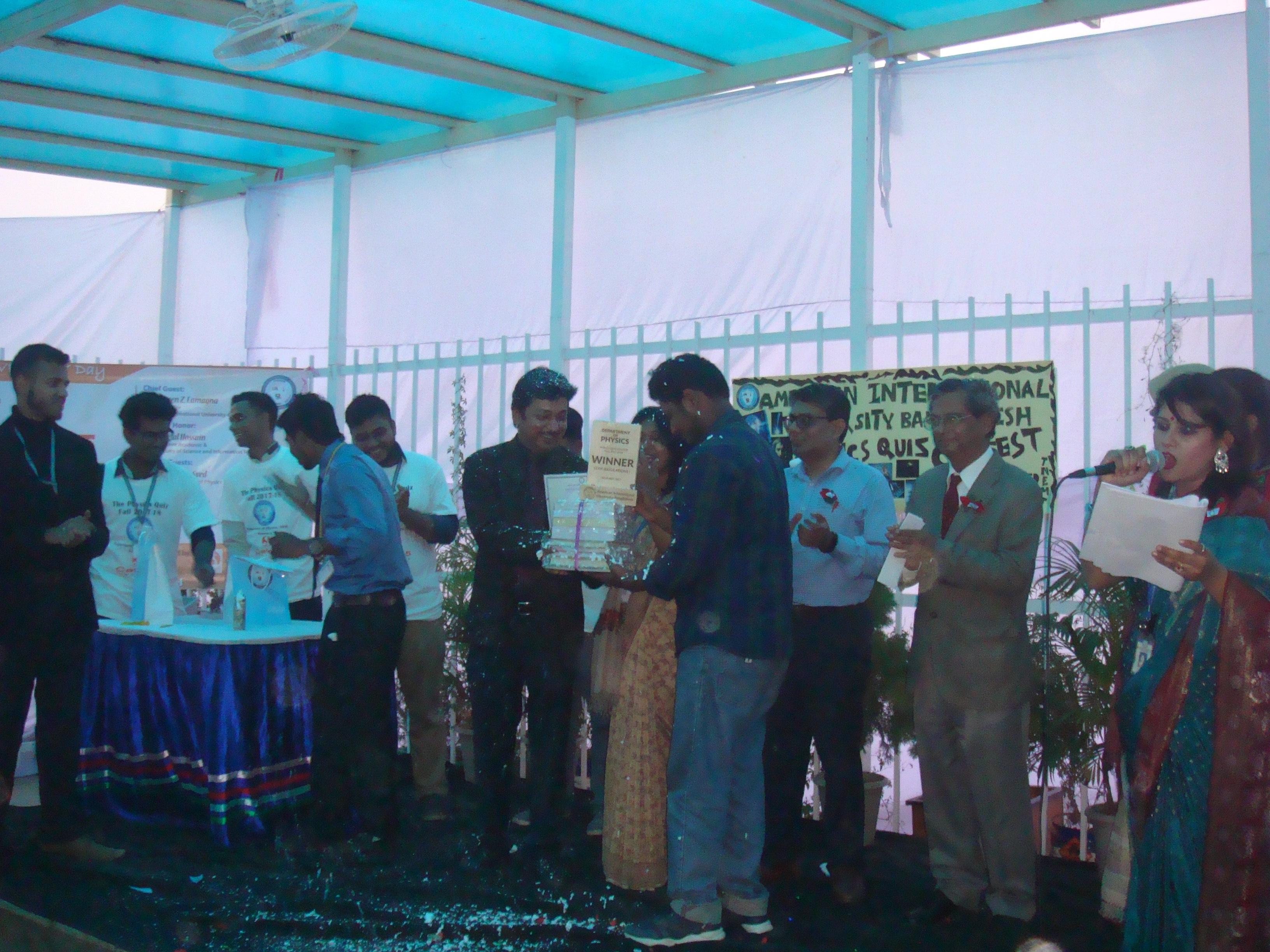 Among the distinguished audience, Professor, Department of Physics, University of Dhaka and General Secretary of Bangladesh Physical Society, Dr. Ishtiaque M. Syed and Emergency In-Charge, Apollo Hospitals, Dhaka, and Director of Café 5 Elephant (Sponsor of the Program), Dr. A Z M Ahsan Ullah were present as the special guests. In their valuable speeches they expressed their impressions and special feelings about the necessity of quiz contests to explore the knowledge of the students. According to the speakers such an initiative by Department of Physics is very much encouraging for the development of the students and their interest in science. Café 5 Elephant has sponsored the T-shirts and the books for the winner, 1st and 2nd runner up positions along with 500-taka gift Boucher for each of the eight contestants of the final phase. Moreover, Dr. A Z M Ahsan Ullah has declared 20% discount for the students and the AIUB members in Café 5 Elephant.