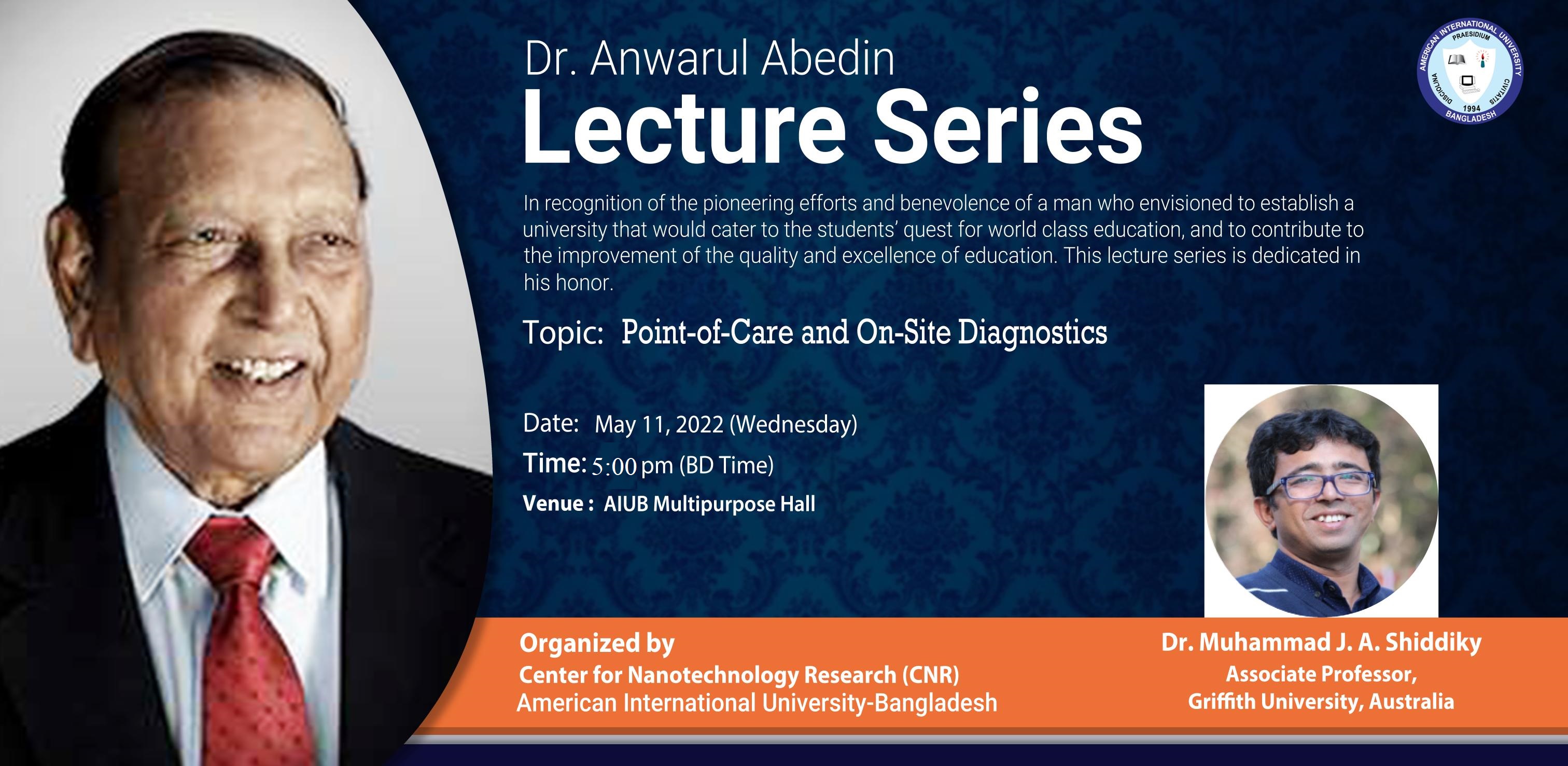 As a part of the "Dr. Anwarul Abedin Lecture Series", a regular development initiative of the American International University-Bangladesh (AIUB), a research talk titled "Point-of-Care and On-Site Diagnostics" was held at Multipurpose Hall, AIUB from 05:00 PM- 07:00 PM (BDT) on May 11, 2022. The Center for Nanotechnology Research (CNR), AIUB organized this event and invited prominent researcher Dr. Muhammad J. A. Shiddiky (Associate Professor, Griffith University, Queensland, Australia) as distinguished speaker and Dr. Md. Tofazzal Islam (Professor, Bangabandhu Sheikh Mujibur Rahman Agricultural University, Gazipur) as session chair.