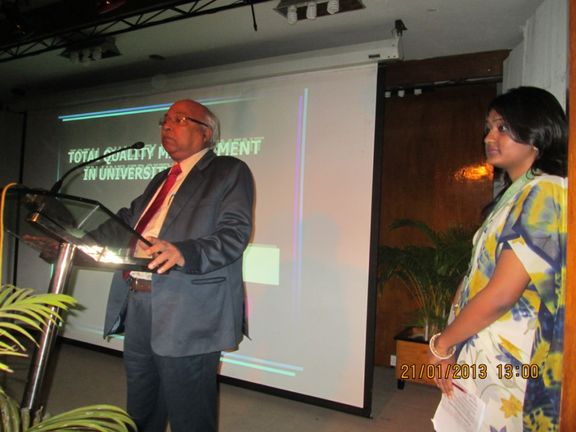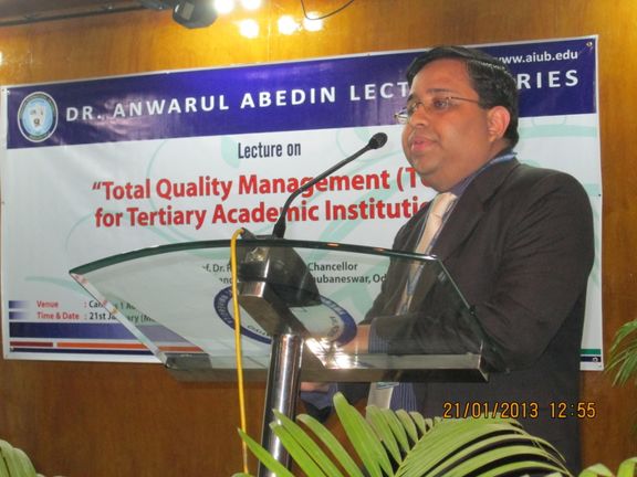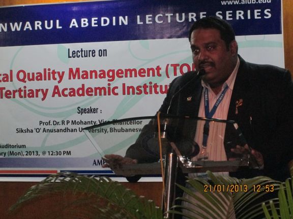 Renowned Expert, Prof. Dr. R P Mohanty, Vice Chancellor, Siksha 'O' Anusandhan University, Bhubaneswar, Odisha, India, delivered a lecture entitled “Total Quality Management (TQM) for Tertiary Academic Institutions” during the Dr. Anwarul Abedin Lecture Series held on 21stJanuary (MON), 2013 at AIUB Auditorium. The Lecture Series was inaugurated by Dr. Ehsanul Huda Chowdhury, Associate Dean of the Faculty of Business Administration on behalf of Prof. Dr. Charles Villanueva, Dean of Faculty of Business Administration. The distinguished speaker was introduced by Dr. Mamun Habib, Faculty of the OM Department. Dr. Mohanty’s lecture has stimulated the participants interest on TQM as a strategy for managing higher education institutions. His lecture was followed with lively interactions with the students and faculty. Mr. Maksudur Rahman, Director of AQAC was also present during the occasion. The Vote of Thanks was expressed by A.K. Nazmul, BBA Program Director and Dr. Nisar Ahmed, MBA Program Director, presented the Certificate of Appreciation to Prof. Dr. Mohanty.