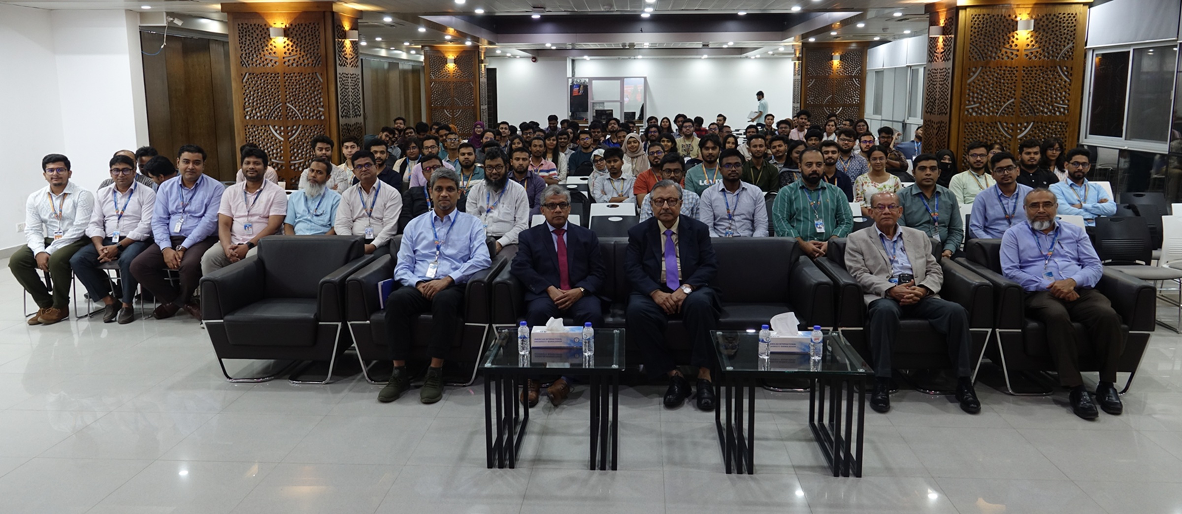 Prof. Dr. Saiful Islam (Vice Chancellor, AIUB) and Prof. Dr. ABM Siddique Hossain (Dean, Faculty of Engineering, AIUB) presented the honorable speaker with a token of gratitude from AIUB for sharing his valuable time and insightful speech on such a crucial topic. Besides, respective faculty members Prof. Dr. Mohammad Abdul Mannan (Professor, Associate Dean [FE], AIUB), Prof. Dr. Md. Saniat Rahman Zishan (Professor, Director [FE], AIUB), Mr. Nafiz Ahmed Chisty (Associate Professor, Head [Undergraduate Program], AIUB), and Prof. Dr. Nowshad Amin (Professor, Deputy Director [Dr. Anwarul Abedin Institute of Innovation], AIUB) graced the stage as well. To conclude, the seminar came to an end with a group photo of all the participants of the seminar to be kept as a form of memento.