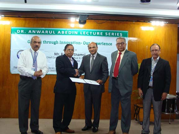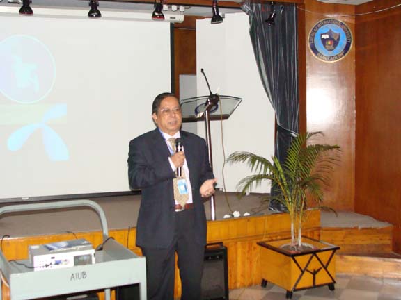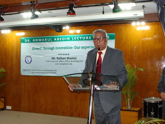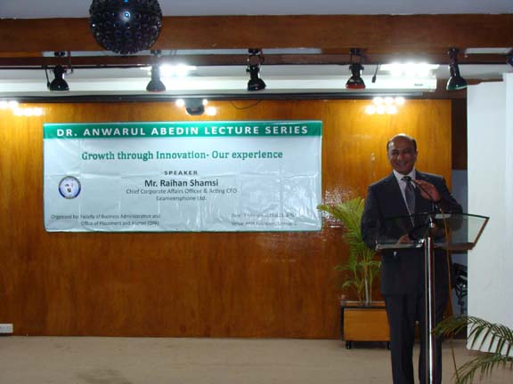 Dr. Anwarul Abedin Lecture Series unfolds for the Spring 2009-2010 with Mr. Raihan Shamsi, Chief Corporate Affairs Officer of Grameenphone as the distinguished guest speaker. Mr. Shamsi delivered a lecture on Growth and Innovation: Our Experience. He underscored in his lecture the growth and development of the company in various areas. The growth is considered phenomenal since Grameenphone’s growth was continuous in significant rate and quantity and also improvement in quality services. The company is consistently in top position among the mobile phone companies in the country. He also disclosed some of the strategies and novel approaches to enhance and sustain the growth of the company. After his lecture-presentation, students were given the opportunity to intellectually interact with the speaker. Some of the relevant issues raised were the possibility of giving discount to students and the effect of sound waves to people’s health brought about by the networks or transmitter built in crowded areas.