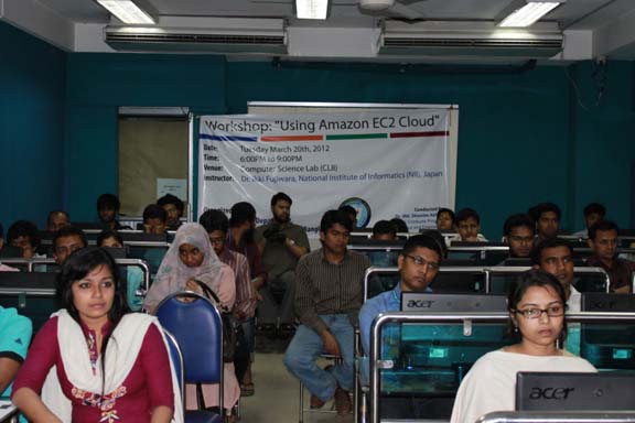 Department of Computer Science of American International University-Bangladesh (AIUB) organized an e-training /webinar on “Using Amazon EC2 Cloud” on 20 March, 2012 at Computer Science Lab (CL8). The speaker, Dr. Ikki Fujiwara, National Institute of Informatics (NII), Japan delivered 3+ hours lectures including different training sessions on Amazon EC2 Cloud environment.