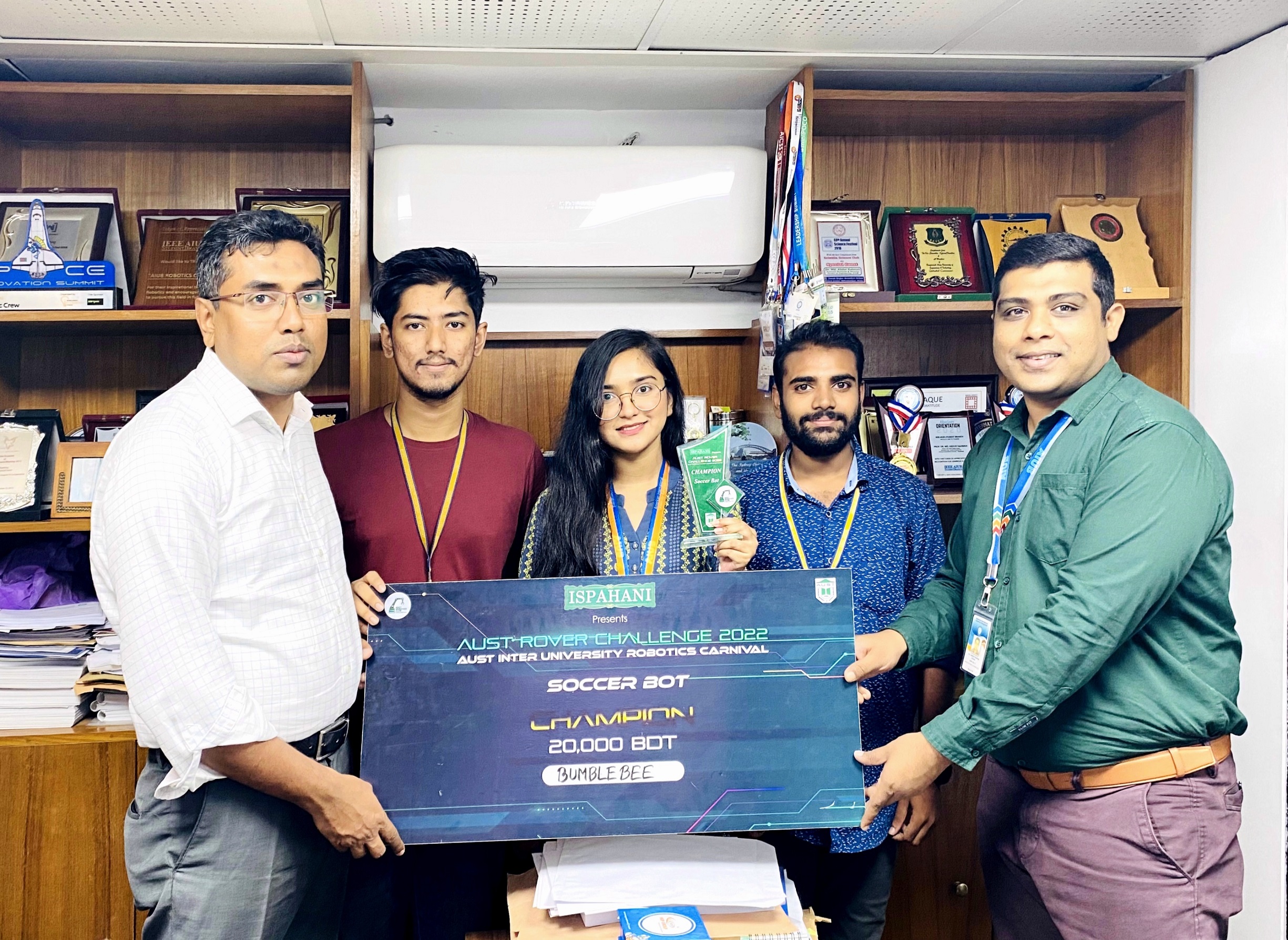MD MOMINUL ISLAM, KANIZ MOHOSINA TABASSUM, RAMEEN MEHRAAN, MEJBAHUL ISLAM JIM representing the Team Bumblebee from the Department of Electrical and Electronics Engineering (EEE), American International University-Bangladesh (AIUB) became the champion in the Soccer Bot segment of the Ahsanullah University of Science and Technology (AUST) Rover Challenge 2022. The event was organized by AUST Robotic Club on 4 August 2022. This event provided a platform for innovators across the country with 4 designated segments - Rover Challenge, Robot Hardware Challenge, Line Following Robot, and Soccer Bot. The efforts of the EEE students of Team Bumblebee were acknowledged with certificates, crests, and prize money.
