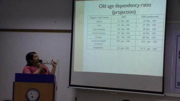 The second paper on ‘Aging in Bangladesh and Its Implication’ actually made a few eyebrows up. Ms Maria Afreen (Student of BBA) lucidly put forward her prescription for the aged people in Bangladesh. Her Presentation was followed by a round of discussions by Dr. Neaz Ahmed and Dr. Tanvir Mahmud. Both are eminent researchers, and of course faculty members in AIUB.