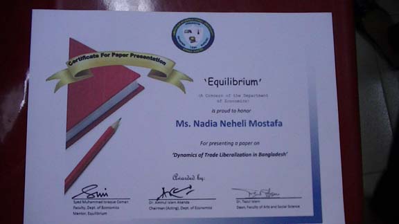 Ms. Nadia Neheli Mostafa (Student of the Department of Economics) presented a paper on ‘Dynamics of Trade Liberalization in Bangladesh’. She explained different trade regimes in Bangladesh since its inception. In the recommendation section of her paper, she voted for diversifying the export basket as more than seventy five percent of the export basket is Ready Made Garments.