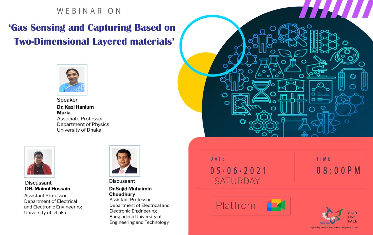 ESAB AIUB Unit Face organized a webinar titled "Gas Sensing and Capturing Based on Two-Dimensional Layered Materials" on Saturday, 5th June 2021. The purpose of this webinar was to spread the concept of nanotechnology and it’s various research areas. Gas Sensing and Capture based on 2-D layered materials, was the topic of discussion. The webinar commenced at 08:00 PM with around 80 participants attending via the virtual platform, Google Meet.