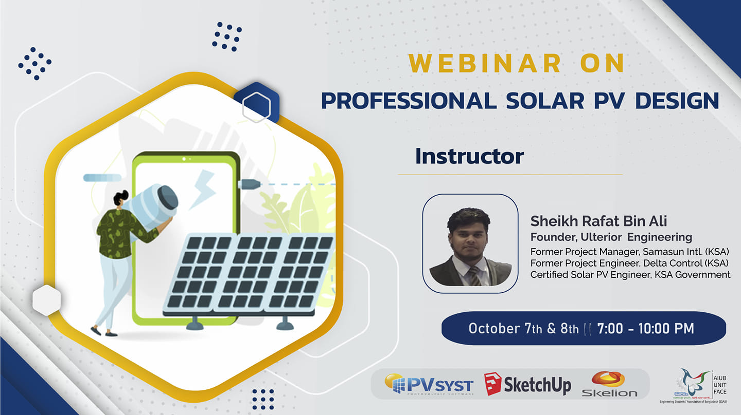 Solar photovoltaic (PV) panels undoubtedly come to peoples' minds when they talk about solar energy. The use of solar PV panels in our country is increasing day by day. At the same time, the demand for solar PV design is rising. Many engineers in our country work with solar PV design, and "ESAB AIUB unit face" organized a "Professional Solar PV Design" workshop for future engineers on the 7th and 8th of October,2021, and completed the workshop in its entirety.