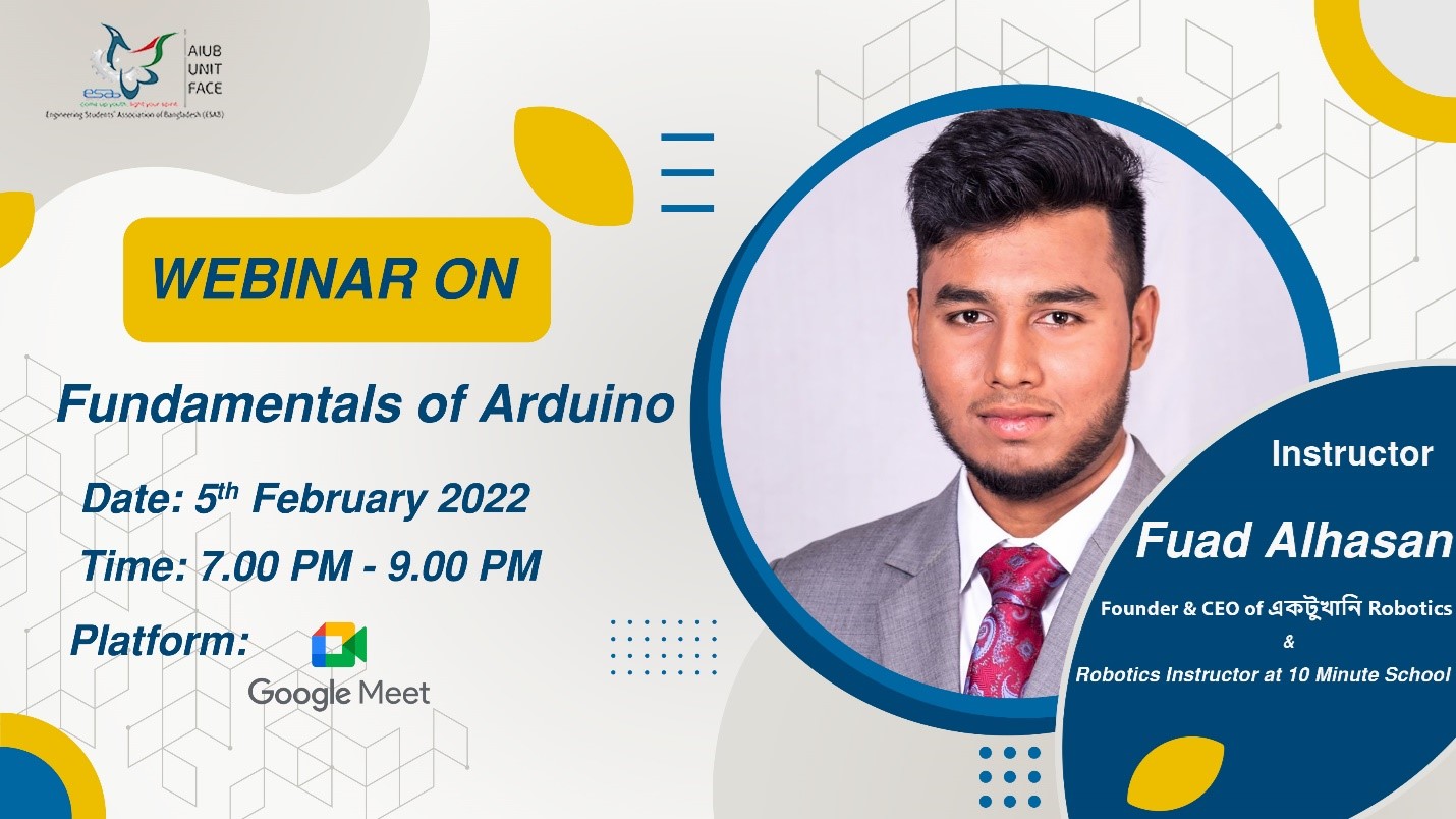 ESAB AIUB UNIT FACE successfully organized a webinar titled "Fundamentals of Arduino" on 5th February 2022 using the Google meet platform. The purpose of this webinar was to provide students with a broad understanding of Arduino. The main event started at 7 PM with the national anthem of the country. The webinar was inaugurated with an opening remark by Prof. Dr. ABM Siddique Hossain, Professor and Dean, Faculty of Engineering, AIUB. He welcomed the speaker as well as the audience. Around 120 students participated in this webinar. The program was instructed by Fuad Alhasan, (Founder & CEO at Ektukhani Robotics and Robotics Instructor at Robi 10 Minute School). The webinar continued for around two hours, and the instructions provided participants with a fundamental understanding of Arduino, including how Arduino works, how to write basic Arduino code, and many more. At the end of the entire workshop, a Q&A session was started, during which the attendees’ asked questions and the speaker responded to their queries. After that, Prof. Dr. ABM Siddique Hossain (Professor and Dean, Faculty of Engineering, AIUB) gave a closing speech. The event was concluded by presenting the speaker with a virtual token of appreciation as a token of gratitude.