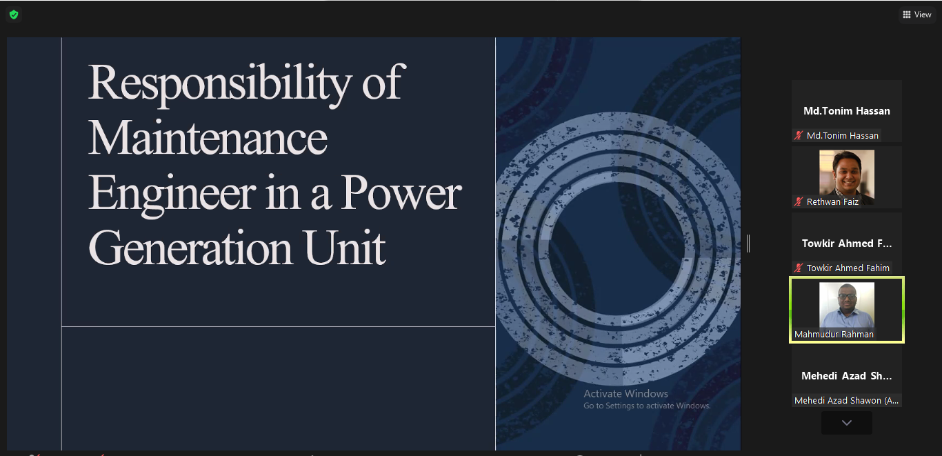 On August 6, 2021, Faculty of Engineering organized a technical session titled “Responsibilities of Maintenance and Operations Engineers at Power Plant” for the newly joined EEE interns of “Physical Plant and Infrastructure (Electrical) Division, AIUB”. The program began at 07:30 PM at online platform Zoom. The purpose of this session was to familiarize the interns about the responsibilities of maintenance engineers at a power station.