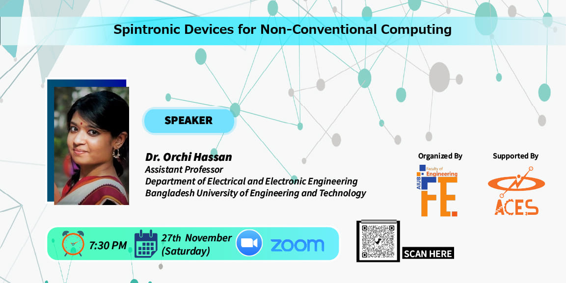 Dr. Orchi Hassan (Assistant Professor, Department of Electrical and Electronic Engineering, Bangladesh University of Engineering Technology) inaugurated her remarks by emphasizing the emergence of Spintronic Technology and added that over the last 15 years, a lot of research has gone into improving transistors, processors, and computers with nano architecture. She explained that Architecture and Packaging, Computing Models, and Devices and Materials are the three key research directions for Electrical and Computer Engineers. Finally, she concluded her presentation by recommending several significant sources of information for enthusiastic audiences, such as publications, blogs, and papers relevant to the research field of Spintronics. Afterwards, a short Q&A session was held where the speaker answered the queries of the participants. Following that Prof. Dr. A.B.M. Siddique Hossain (Dean, Faculty of Engineering, AIUB; Advisor, ACES) praised our honorable speaker for simplifying the topic. He thanked the distinguished speaker with a virtual gesture of appreciation for delivering such a great presentation.