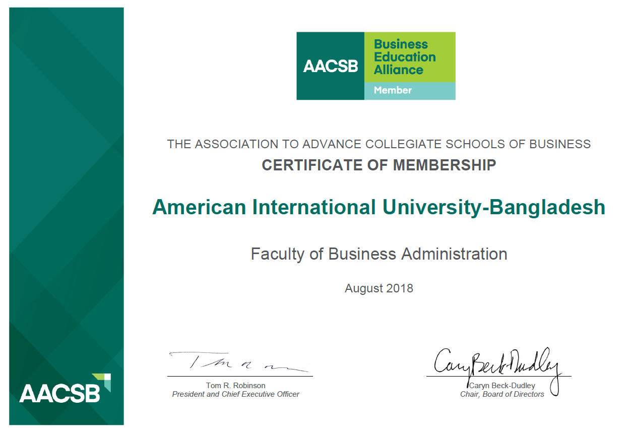 In line with the thrust of the American International University-Bangladesh for internationalization, the Faculty of Business Administration(FBA) has been granted a Certificate of Membership of the Association to Advance Collegiate Schools of Business (AACSB) based in USA after it has complied with all its requirements. The membership is granted exclusively for business schools only. With this membership, our faculty and students can benefit from the rich and extensive resources of the organization. This is an added value to our business students and graduates having obtained their degree from a Business School which is a member of AACSB. Let us keep our membership with pride and honor. Below are the links which the faculty members and students can access for any academic information and enrichment. Our membership with AACSB International is a valuable resource. I encourage each of you to get involve and explore the benefits and services available to us a members of AACSB.