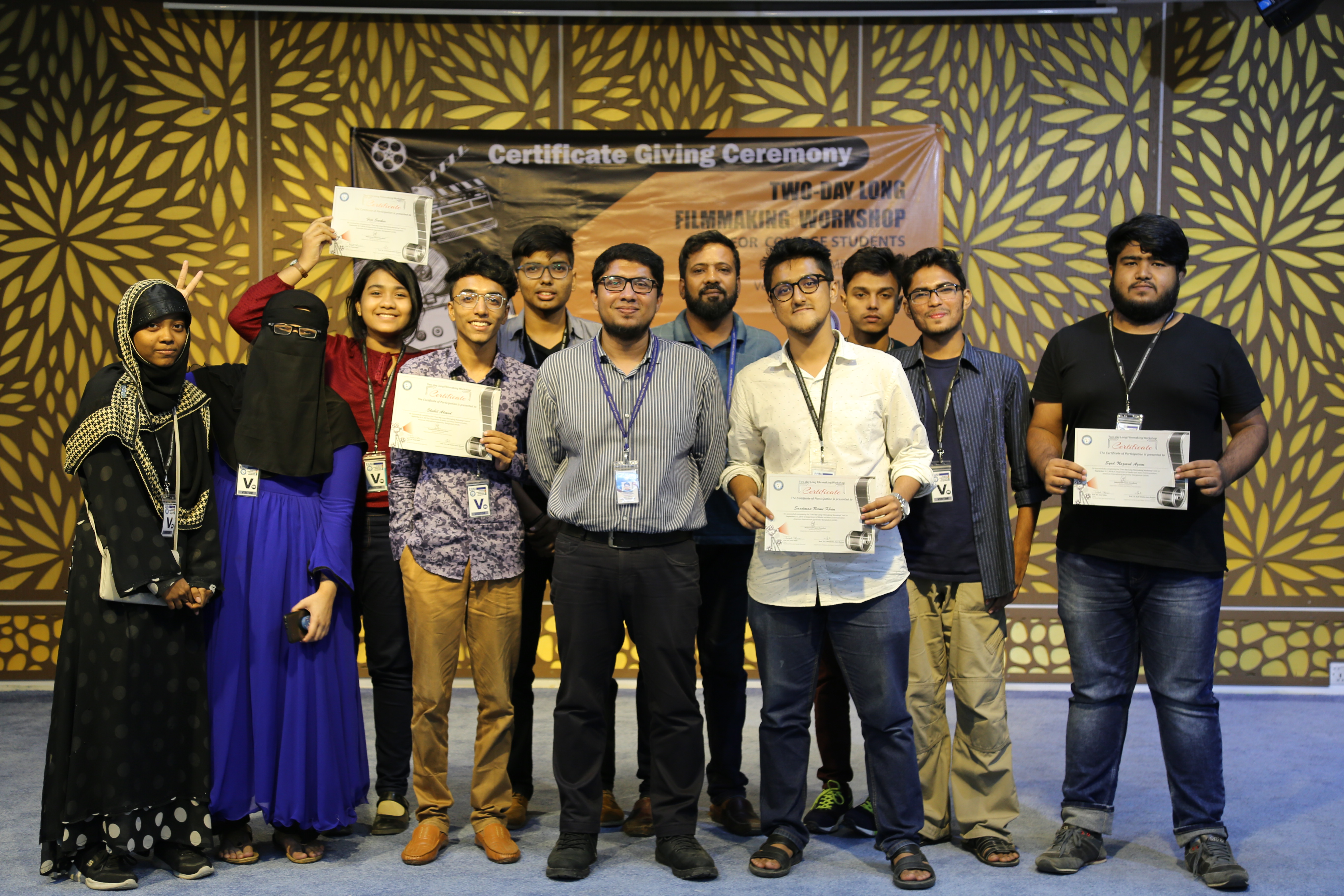 A two-day long intensive filmmaking workshop for the college students was conducted on September 6-7, 2019 at the Department of Media and Mass Communication, AIUB. 10 students from different colleges of Dhaka participated in this workshop. Students attended eight sessions in two days where they learned the fundamental concepts of filmmaking: script writing, camera operation, direction, editing, etc. They worked in groups, each comprising of five members, and developed scripts, directed and edited their films. Mohammed Foysal Chowdhury, Assistant Professor, Department of Media and Mass Communication conducted all the sessions. Md. Mosfiqur Rahman, Editor helped with the practical sessions and three students of the Department, Tasfik Zaman, Karaboi Kaiser, and Imran Hossain, worked as volunteers to coordinate the entire event. Two films made by the participants were screened in the concluding program followed by the distribution of Certification of Appreciation among the students. Department of Media and Mass Communication coveys its gratitude to the AIUB management for providing with all the resources and logistic support to successfully conduct the workshop.