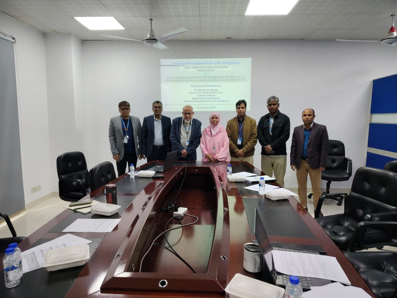 Dr. Rowshon Ara Romke, Assistant Professor at the Department of Social Science, presented her research findings on 16 January 2025 regarding the inclusion of Persons with Disabilities (PWDs) in local government in Bangladesh. Funded by the AIUB Grant, her study, titled Inclusion of Persons with Disabilities in the Local Government of Bangladesh: Prospects and Problems, aimed to identify barriers to PWD participation in governance.