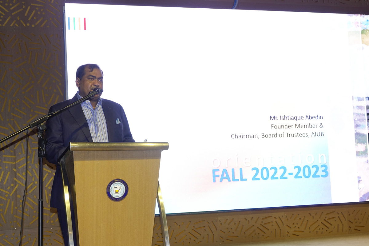 The orientation of newly enrolled freshmen students at the American International University-Bangladesh (AIUB) in the Fall 2022-23 semester was held at the AIUB premises on Thursday, 15 September 2022. The orientation was held in six sessions for different faculties for both undergraduate and graduate programs. Representatives of the Office of Student Affairs, AIUB briefed the freshmen students about the rules and regulations of the university along with the procedures of successfully utilizing the resources and tools for their academic progress. Mr. Ishtiaque Abedin, the Honorable Chairman, Board of Trustees of AIUB was present as the chief guest in the orientation sessions. He welcomed the freshman students and their parents to AIUB and expressed his gratitude for their wholehearted participation. The Registrar, Deans, Directors, Heads of Departments, faculty members, key officials were also present during the sessions.