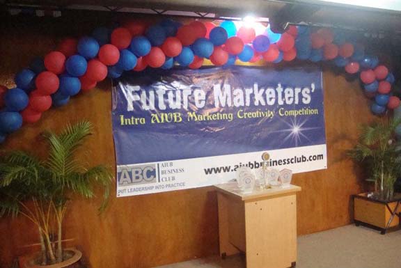 For the First time in AIUB, AIUB Business Club (ABC) organized a competition especially for the Marketing major students- "Future Marketers'-2011", under the supervision of the Department of Marketing. The objective of this competition was to give a platform to bring out the analytical and real world marketing skills and creativity among business students and also to prepare the marketing major student to compete in various national competitions as most of the national level contests prefer marketing major student as participants.