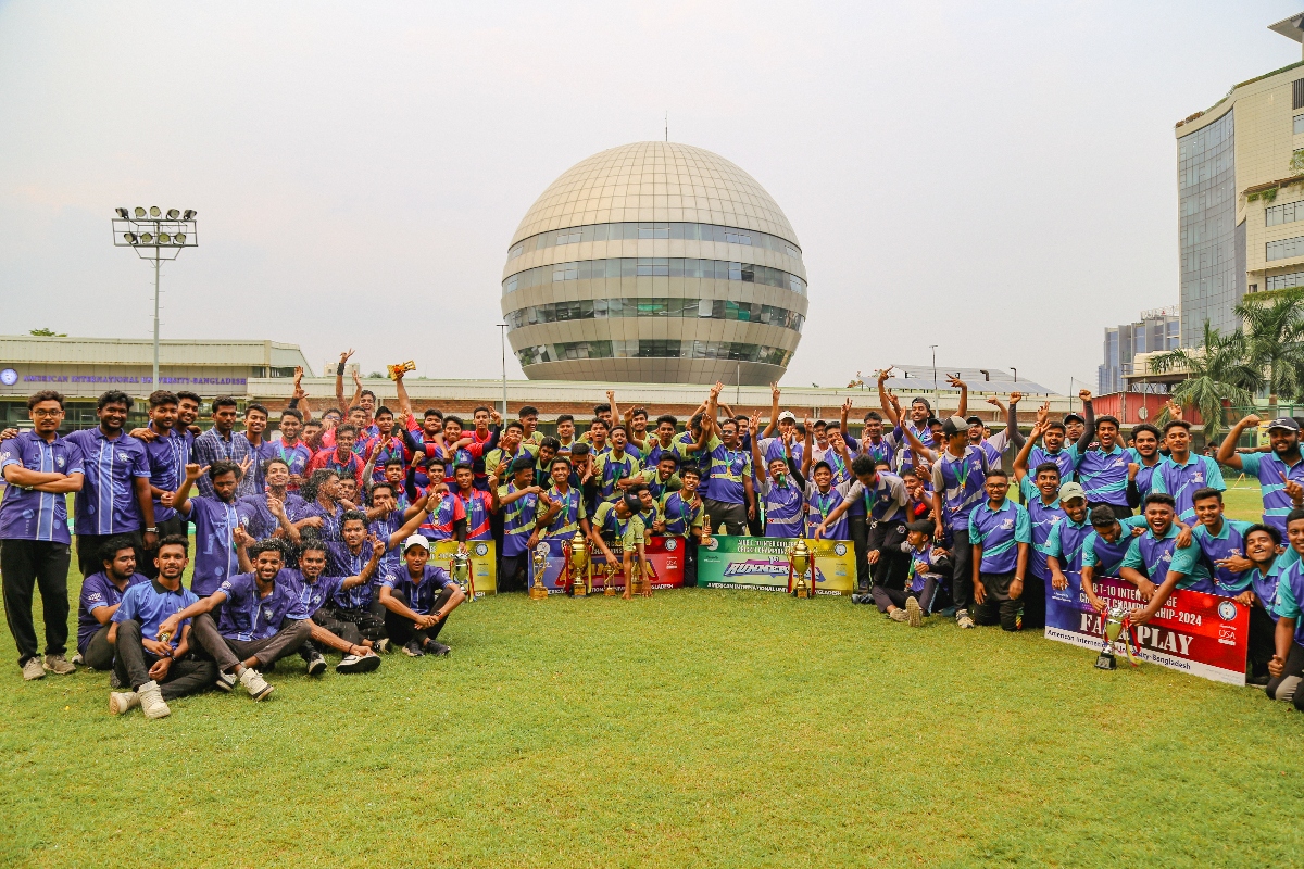The vibrant sports field of the American International University-Bangladesh (AIUB) came alive with excitement as the grand finale and prize-giving ceremony of the "AIUB Inter College T-10 Cricket Championship 2024" took place on Thursday, May 23, 2024. The championship, a marquee event organized by the AIUB Office of Sports in collaboration with the Office of Student Affairs, kicked off on May 19, 2024, bringing together 32 enthusiastic college teams from across Dhaka City. To add to the excitement, Bruvana served as the official beverage partner, ensuring that players and spectators stayed refreshed, while Savoy, as the official ice cream partner, provided delightful treats throughout the event.
